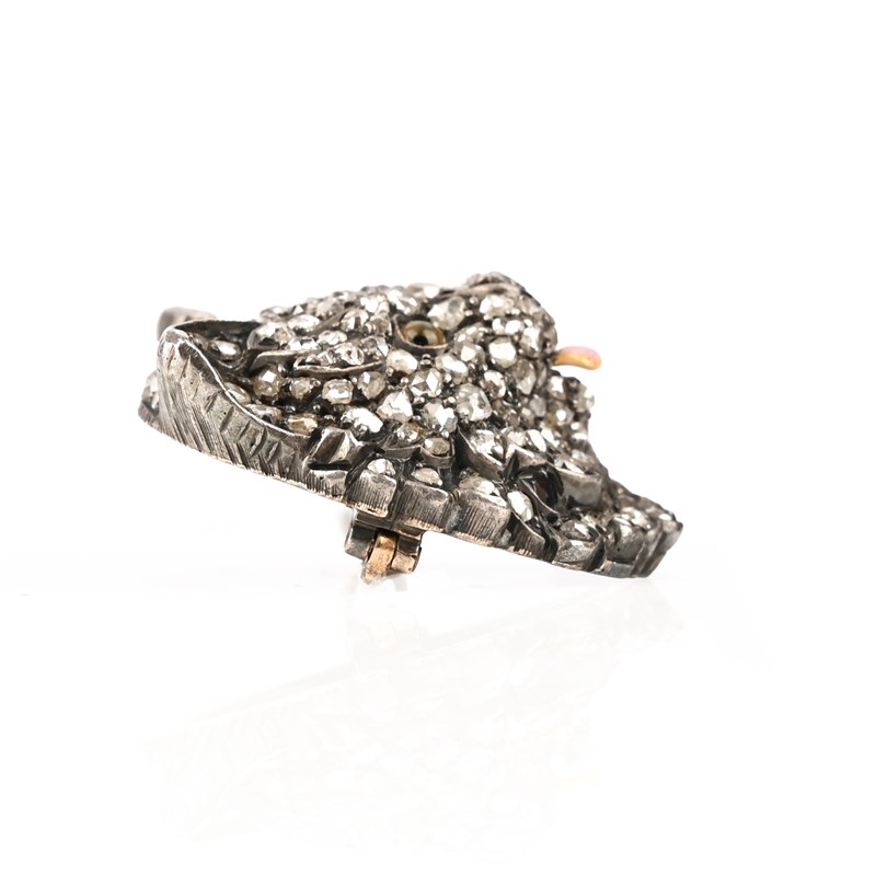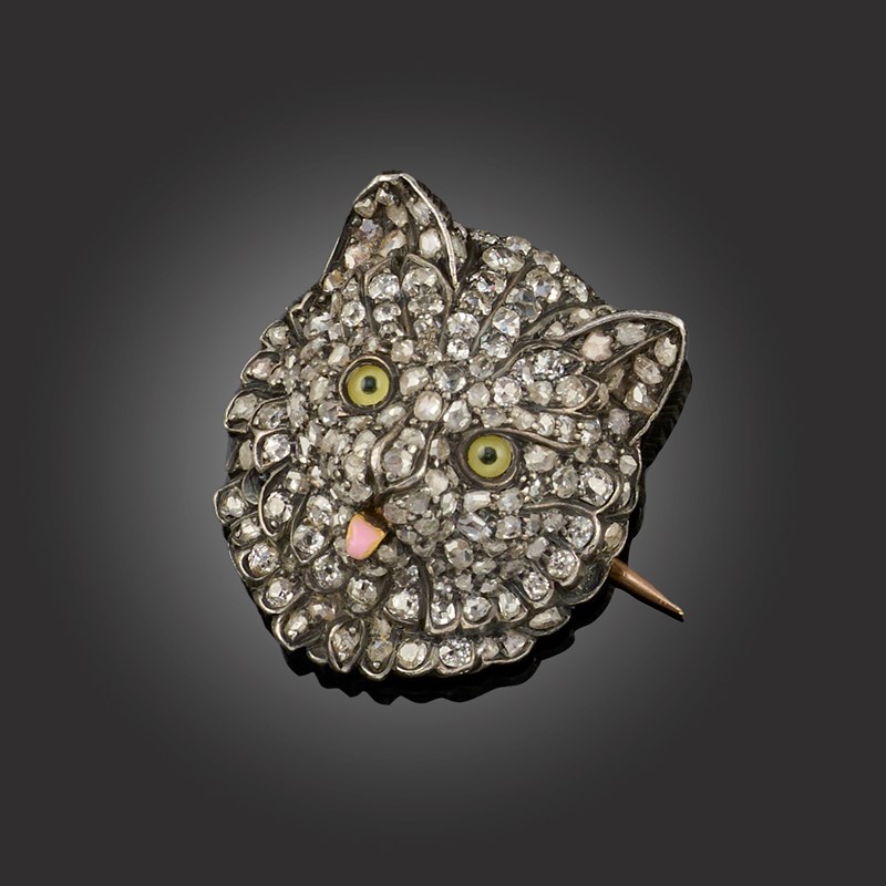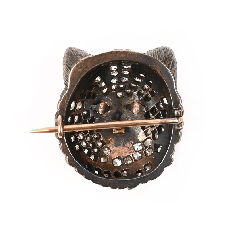 A LATE 19TH CENTURY NOVELTY DIAMOND AND ENAMEL BROOCH, designed as a cat's head, pavé-set with rose-cut diamonds, with a pink enamel tongue and glass eyes, mounted in silver and gold, length 3cm, two diamonds missing