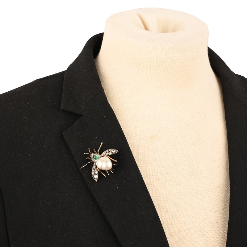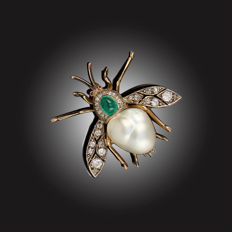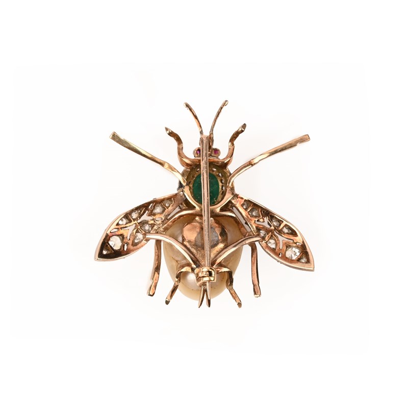 A LATE 19TH CENTURY GEM-SET INSECT BROOCH, designed as a stylised fly, its body composed of a baroque pearl below an emerald cabochon within a surround of old cushion-cut diamonds, with ruby eyes and diamond-set wings, mounted in silver and gold, length 2.3cm