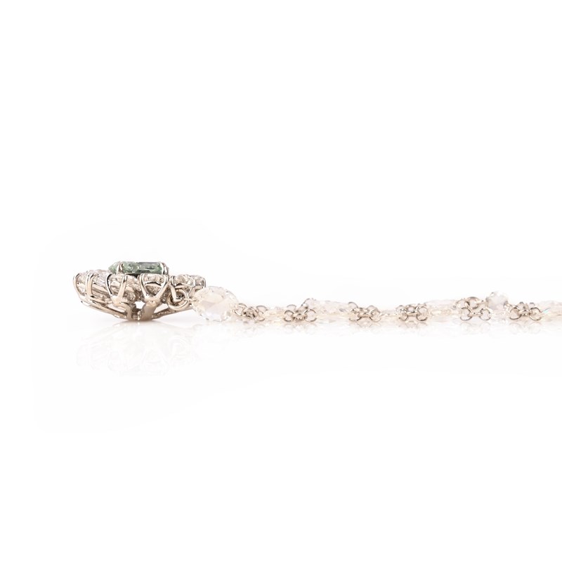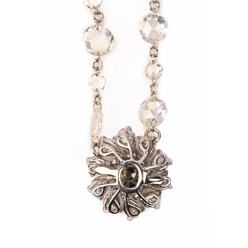 A DIAMOND-SET GOLD PENDANT, centring on a fracture-filled blue diamond within pear-shaped diamond border on a diamond-set chain in white gold, length 42cm