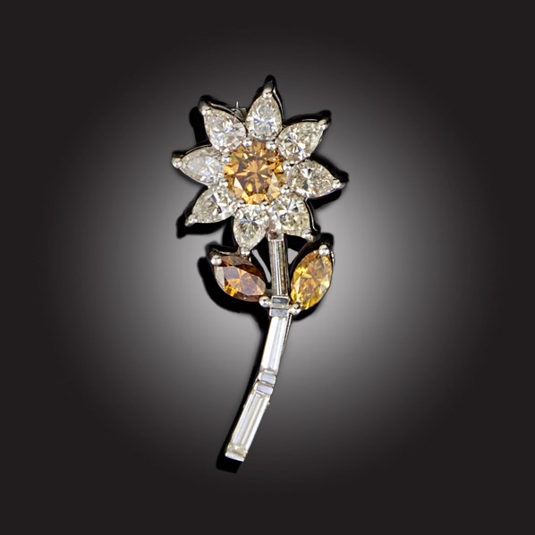 A FANCY DIAMOND AND WHITE DIAMOND BROOCH, in the form of a flower with a central circular-cut fancy brown diamond within a surround of pear-shaped white diamonds on a diamond stem with fancy brown diamond leaves in white gold, plaque for 750, length 3.5cm