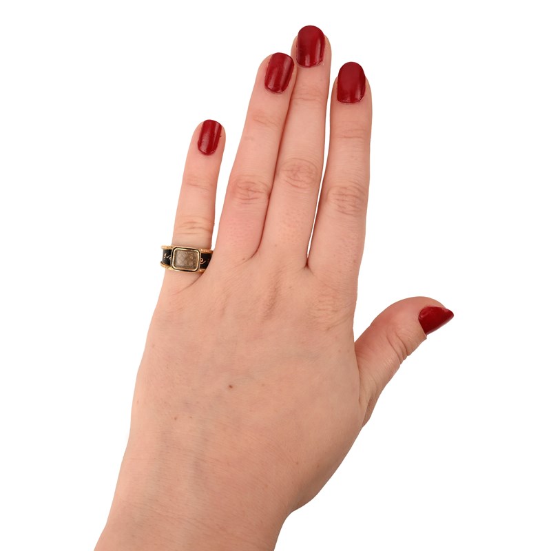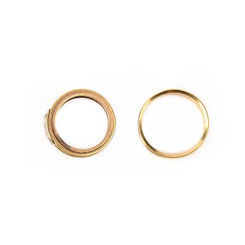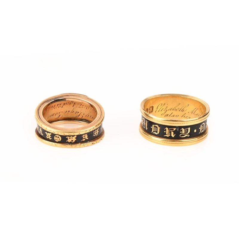 TWO 19TH CENTURY MOURNING RINGS, C1836/37, comprising: a mourning ring with a central black enamel band with the words 'IN MEMORY OF' in reserve, inscribed to the interior 'Elizabeth Medlicott died 26th Jan 1837 aged 86, also her daughter CM 31st Jan 1841 at 62', in 18ct yellow gold, maker's marks TG, London hallmarks for 1836, size P and a mourning ring with a central black enamel band with the words 'IN MEMORY OF' in reserve, centring on a glazed panel of hairwork, inscribed to the interior 'Mary Sayre Gamble, Died 23rd Aug 1837. Aged 21 Yrs 5ms & 13ds', in yellow gold, size J