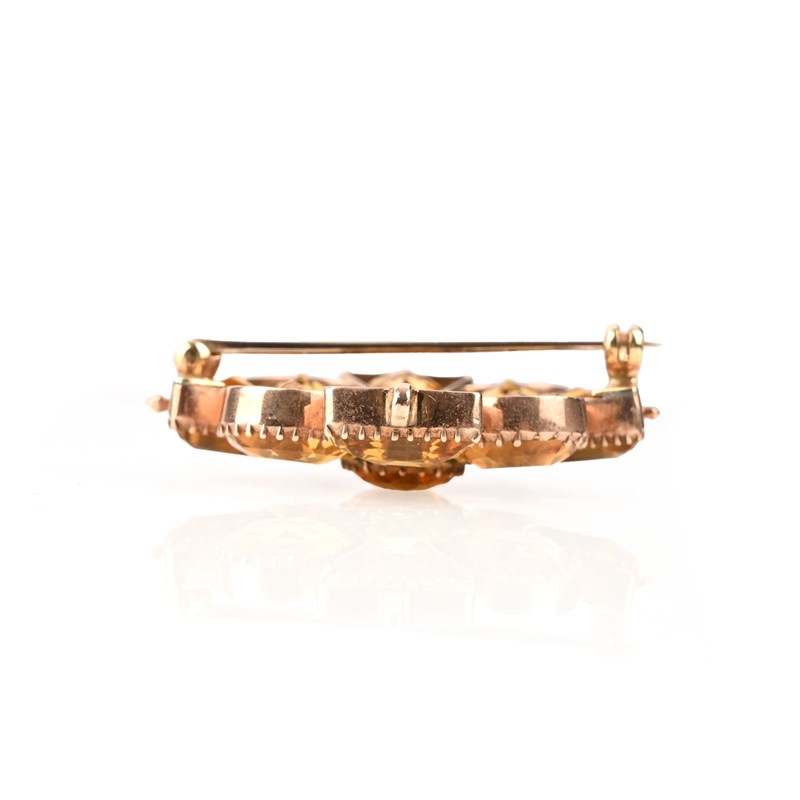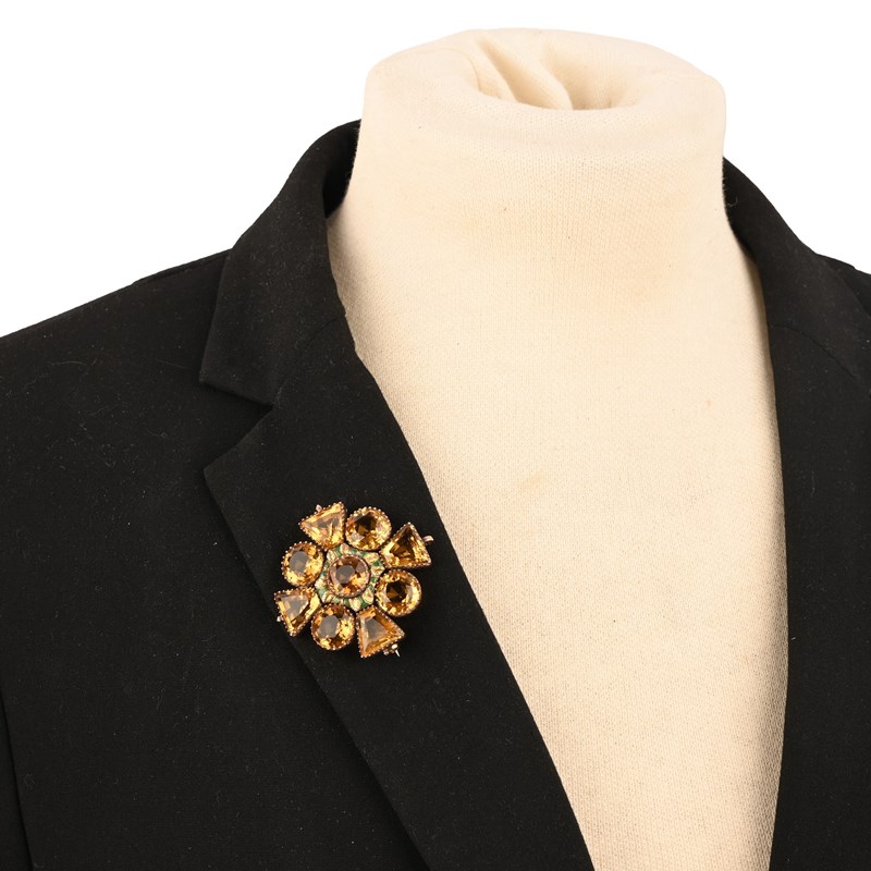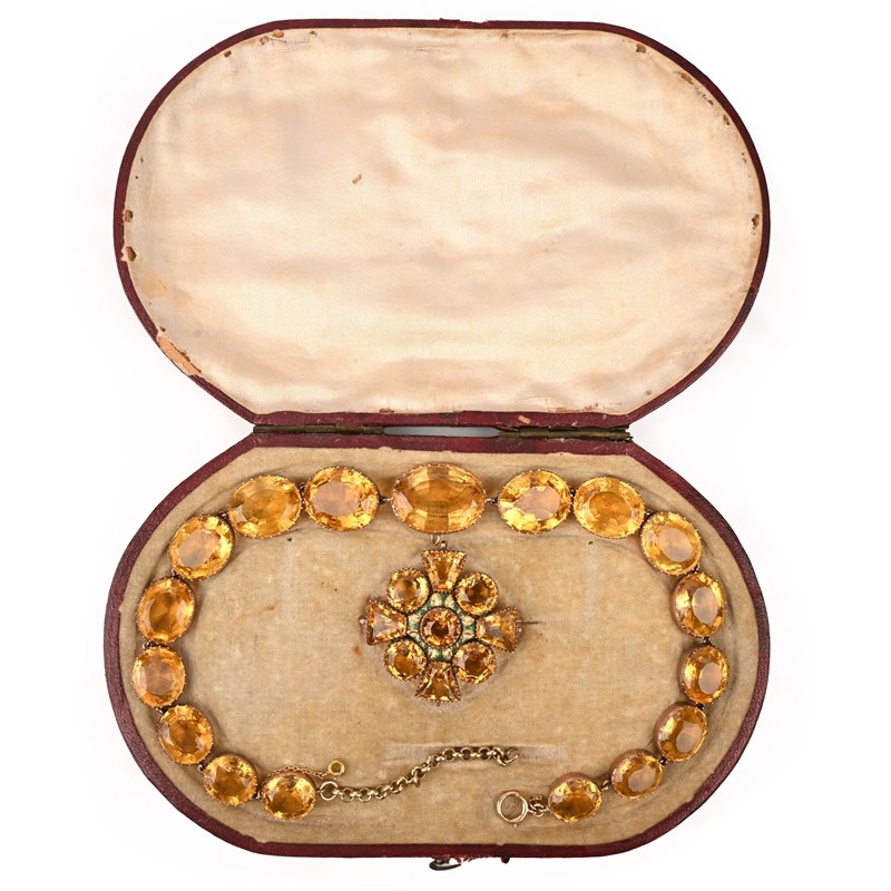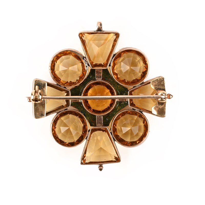 A VICTORIAN CITRINE RIVIÈRE NECKLACE AND BROOCH/PENDANT, comprising: a rivière necklace, set with graduated oval-shaped citrines in gold collets, length 35-40.5cm; and a brooch/pendant, of cruciform design, set with trapezoid and circular-cut citrines around a foliate border detailed in green enamel, in gold collets, width 4.2cm; cased