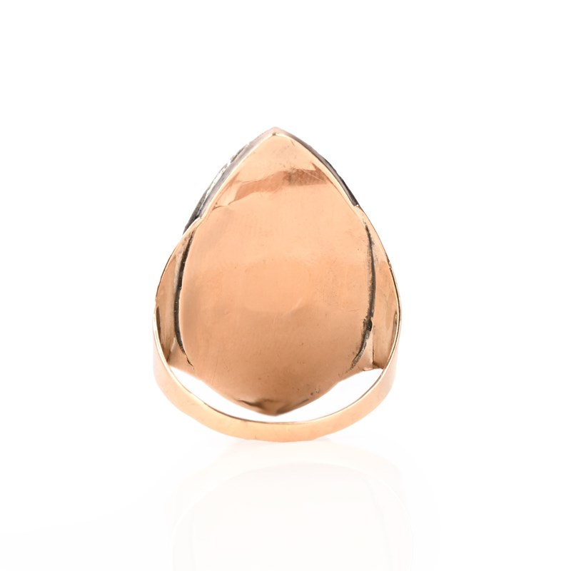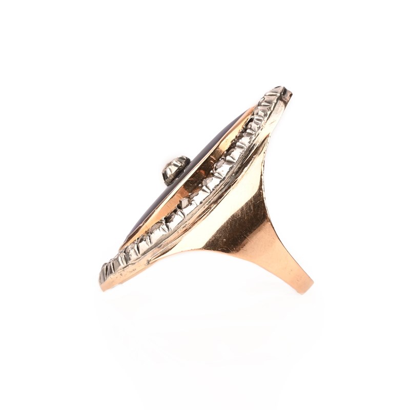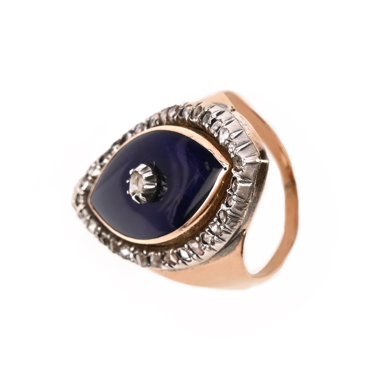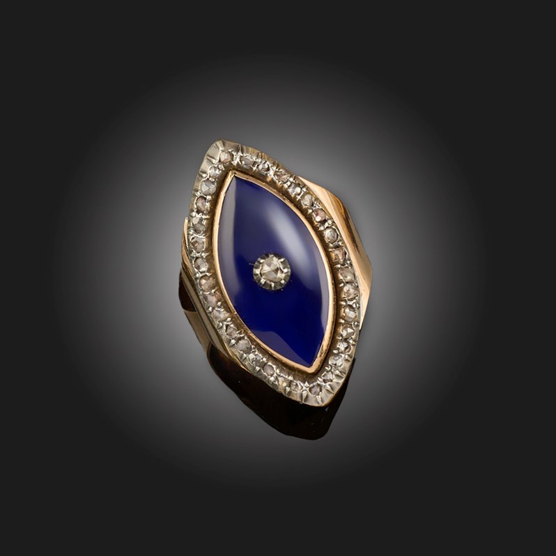 A LATE 18TH CENTURY DIAMOND RING, of navette design, centred with a rose-cut diamond against a blue glass ground within a diamond-set border, mounted in silver and gold, size O 1/2