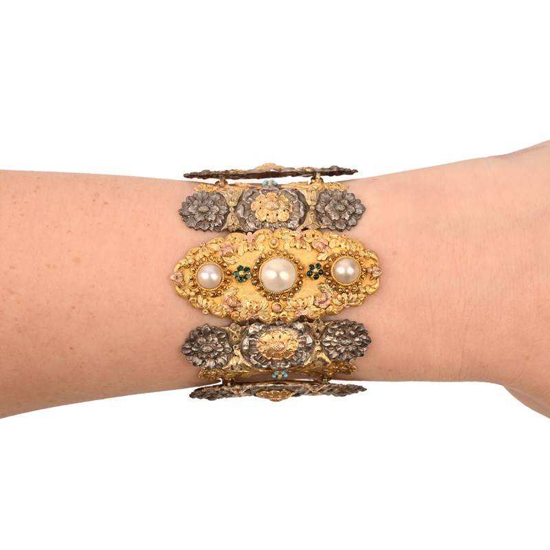 AN EARLY 19TH CENTURY MABÉ PEARL AND ENAMEL BRACELET, the central oval link in tri-colour gold set with three graduated mabé pearls alternating with two green enamel flowerheads within a scrolling floral border, to a strap composed of oblong links in silver and gold carved as floral motifs, alternating with slender gold links carved as floral stems and centred with blue and yellow enamel flowerheads, length 17.5cm, cased