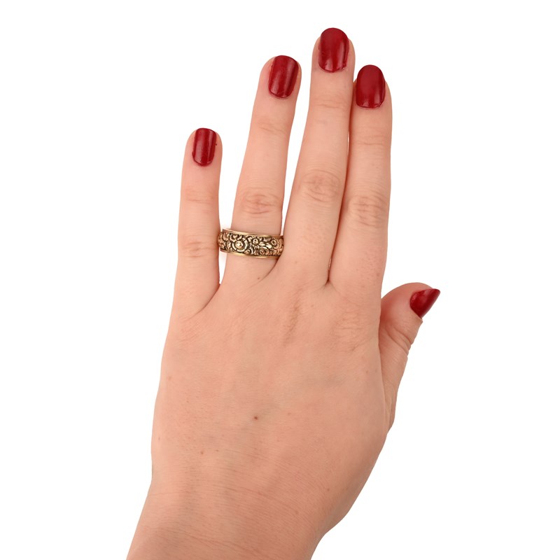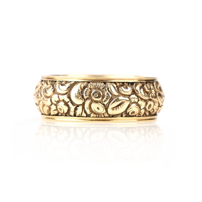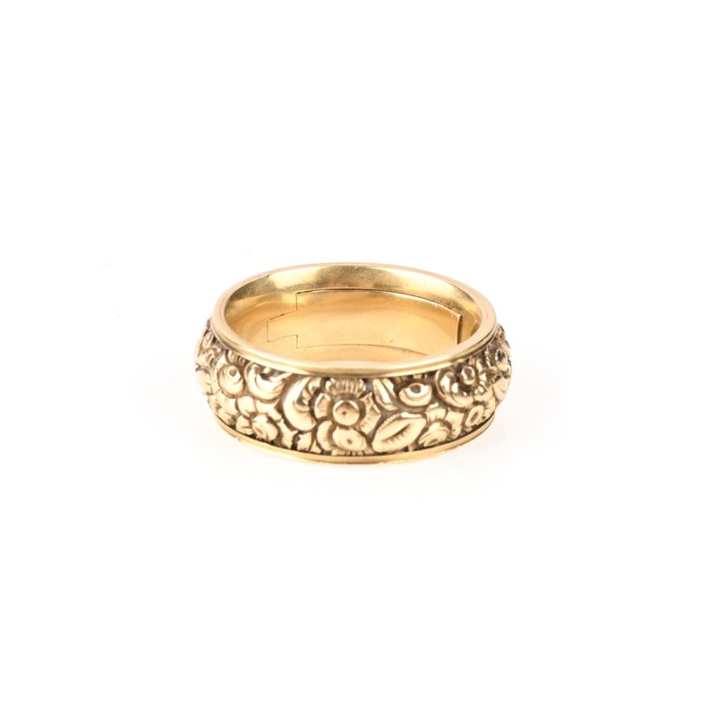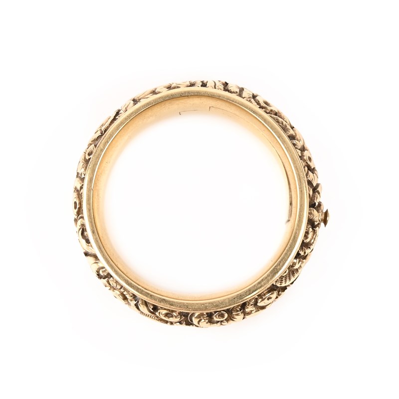 AN EARLY 19TH CENTURY GOLD POISON RING, chased with floral scrolls between polished borders, the interior with a hinged cover opening with the press of a button within the outer floral decorations to reveal a vacant compartment, size N, 7g