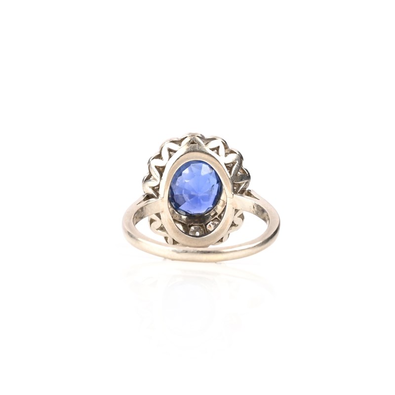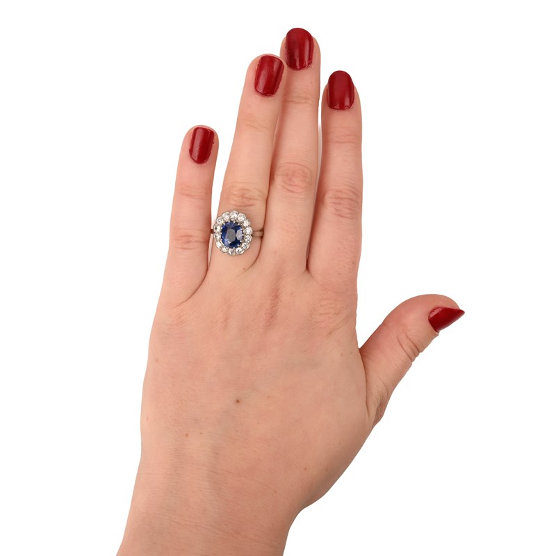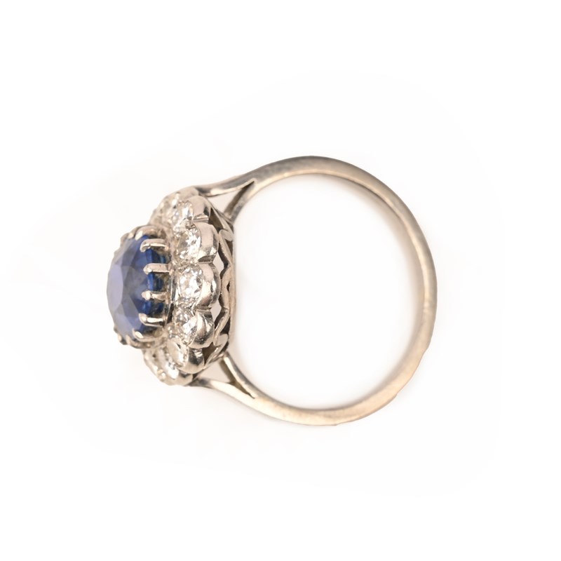A SAPPHIRE AND DIAMOND CLUSTER RING, EARLY 20TH CENTURY, the oval-shaped sapphire weighing approximately 3.50cts, set within a surround of old circular-cut diamonds in platinum, size K 1/2