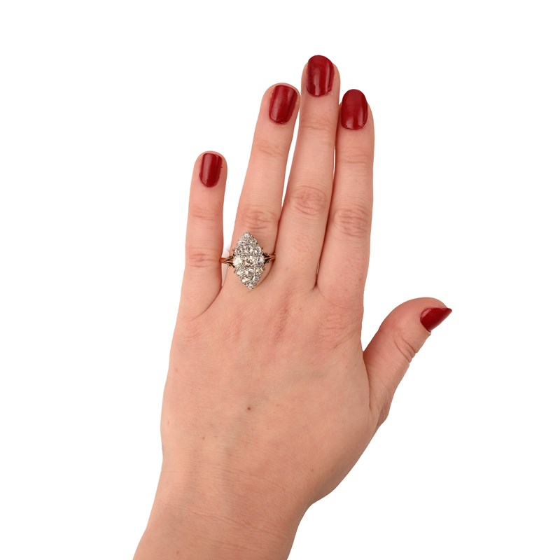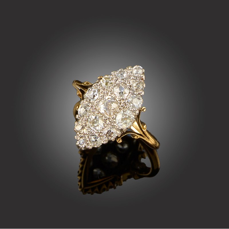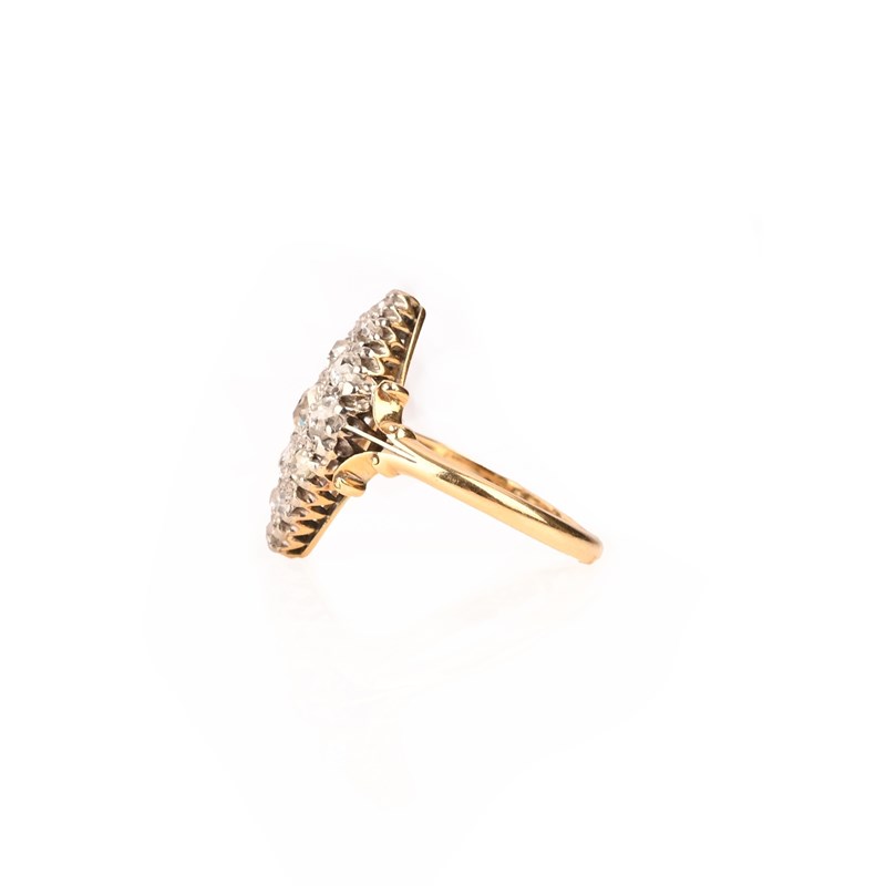 AN EARLY 20TH CENTURY DIAMOND CLUSTER RING, C1901-1902 of navette-shaped design pavé-set with cushion-cut diamonds, in 18ct yellow gold, maker's mark AWH, with Chester hallmarks for 1901-1902, size O