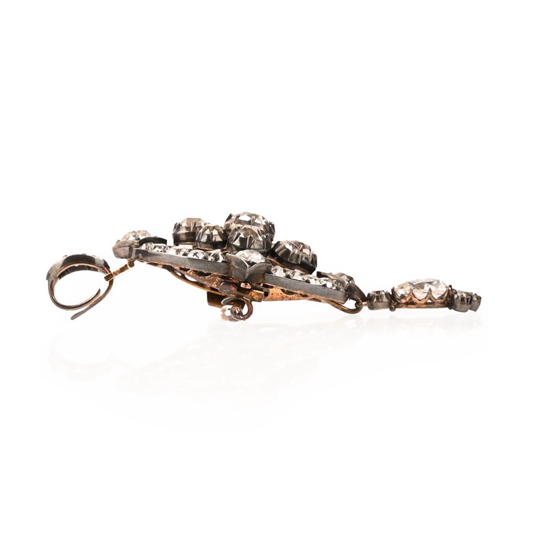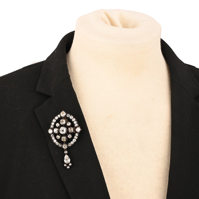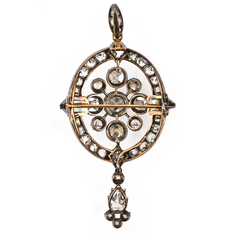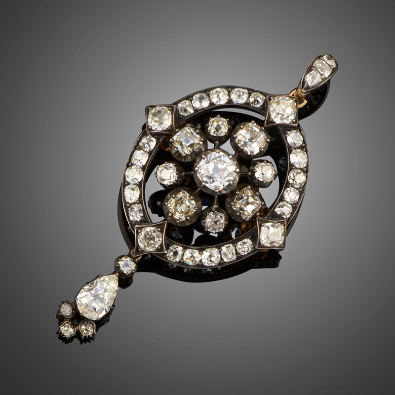 A VICTORIAN DIAMOND BROOCH/PENDANT, LATE 19TH CENTURY, the central cluster of cushion-shaped diamonds within an oval surround quartered with lozenge settings all set with cushion-shaped diamonds, to a removable diamond-set bail and suspending a removable drop set with pear-shaped and cushion-shaped diamonds, mounted in silver and gold, pin detaches via clasps so that the central plaque could be use as a clasp, total approximate diamond weight approximatley10.00cts total length 7.8cm