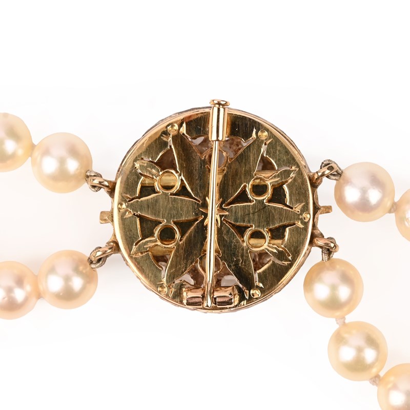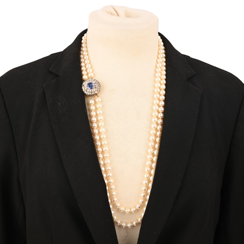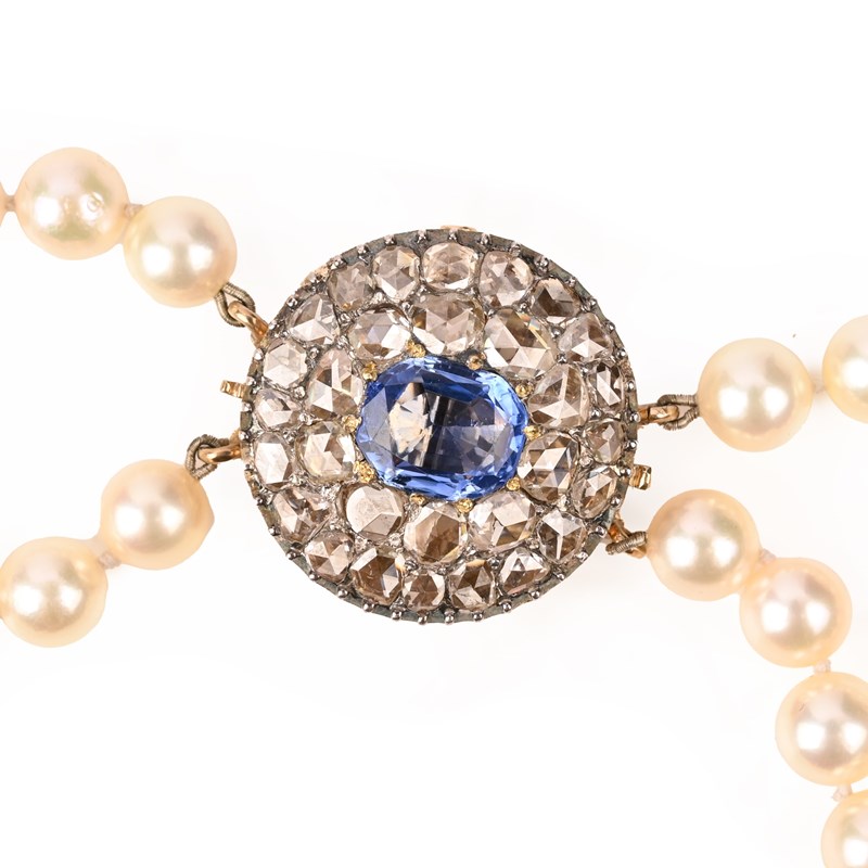 A CULTURED PEARL, SAPPHIRE AND DIAMOND NECKLACE, 19TH CENTURY AND LATER, composed of two rows of cultured pearls to a 19th century diamond and sapphire clasp, the clasp set to the centre with an oval-cut sapphire within concentric borders of rose-cut diamonds, in silver and gold, the clasp detaches to be worn independently as a brooch, clasp diameter 2.5cm, necklace length 74cm