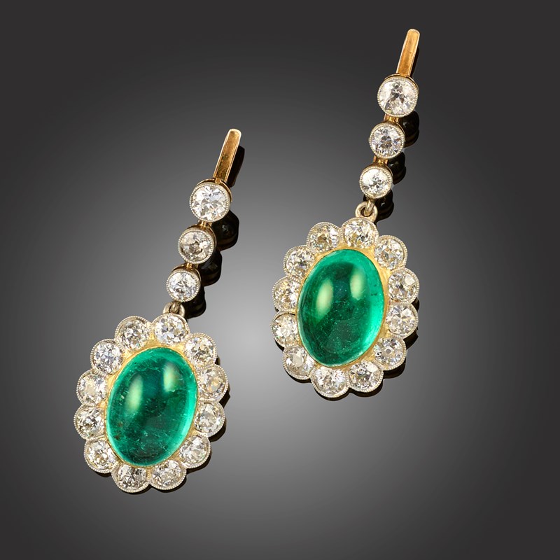 A PAIR OF EMERALD AND DIAMOND DROP EARRINGS, the oval emerald cabochons set within a surround of old circular-cut diamonds and suspending from a further line of diamonds in yellow gold, length 3.8cm, case