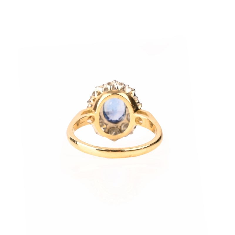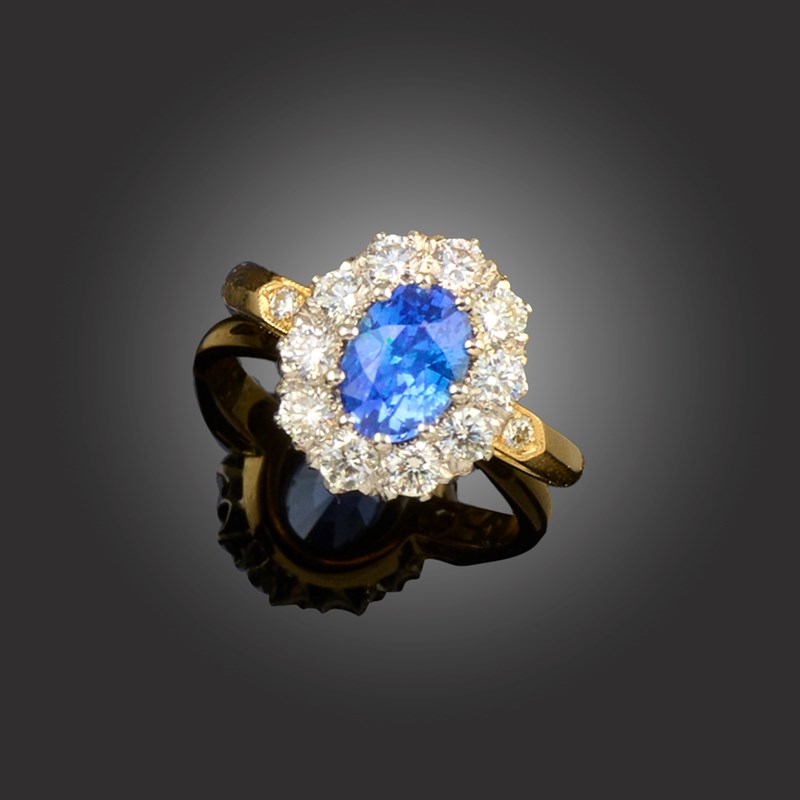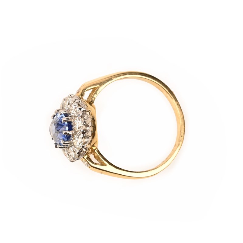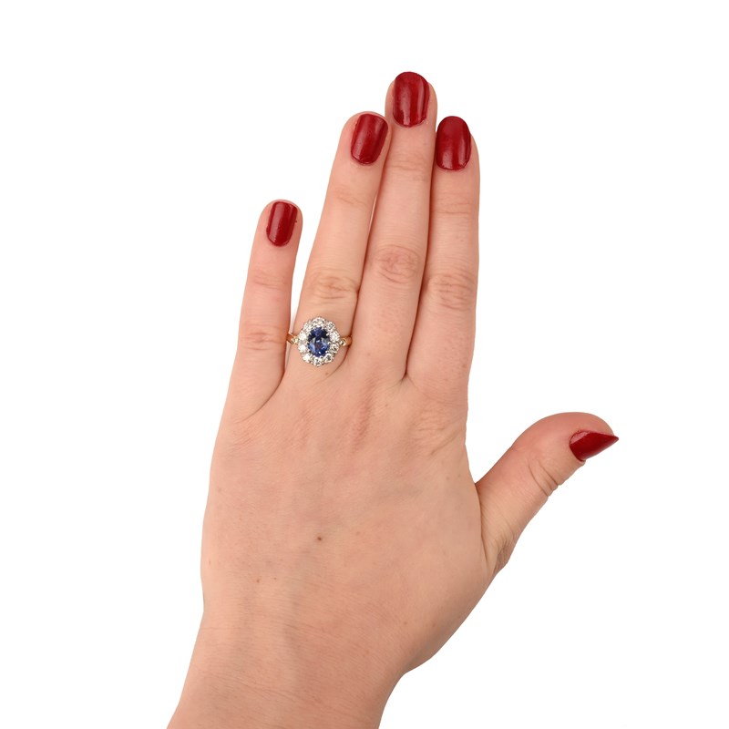 A SAPPHIRE AND DIAMOND CLUSTER RING