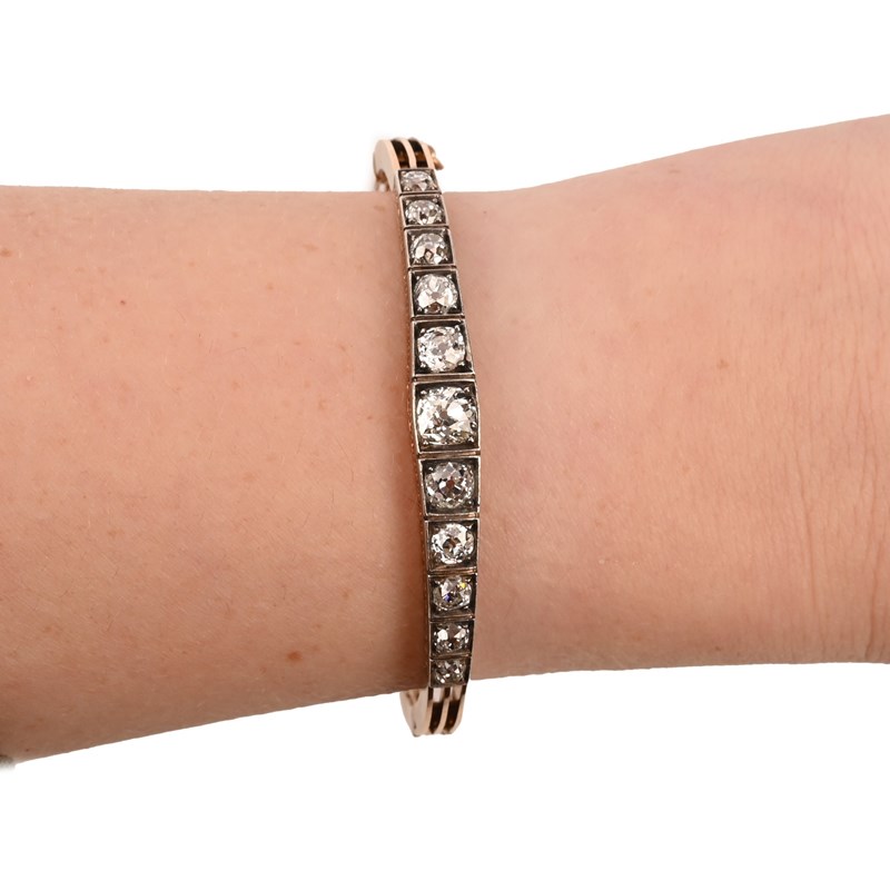 A LATE 19TH CENTURY DIAMOND BANGLE, set with graduated old cushion-shaped diamonds in silver and gold, internal circumference 16cm, 15g