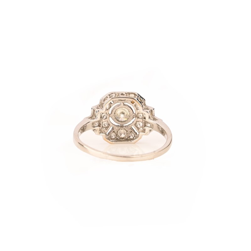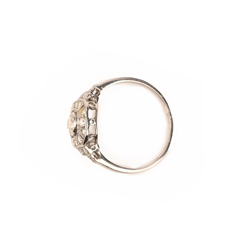 A DIAMOND CLUSTER RING, of geometric design, set with graduated round brilliant-cut diamonds, in platinum, size N 1/2