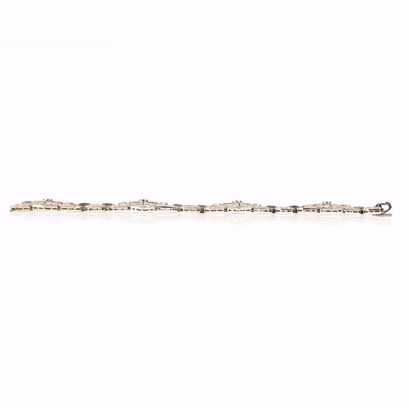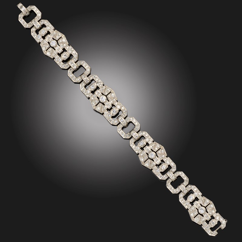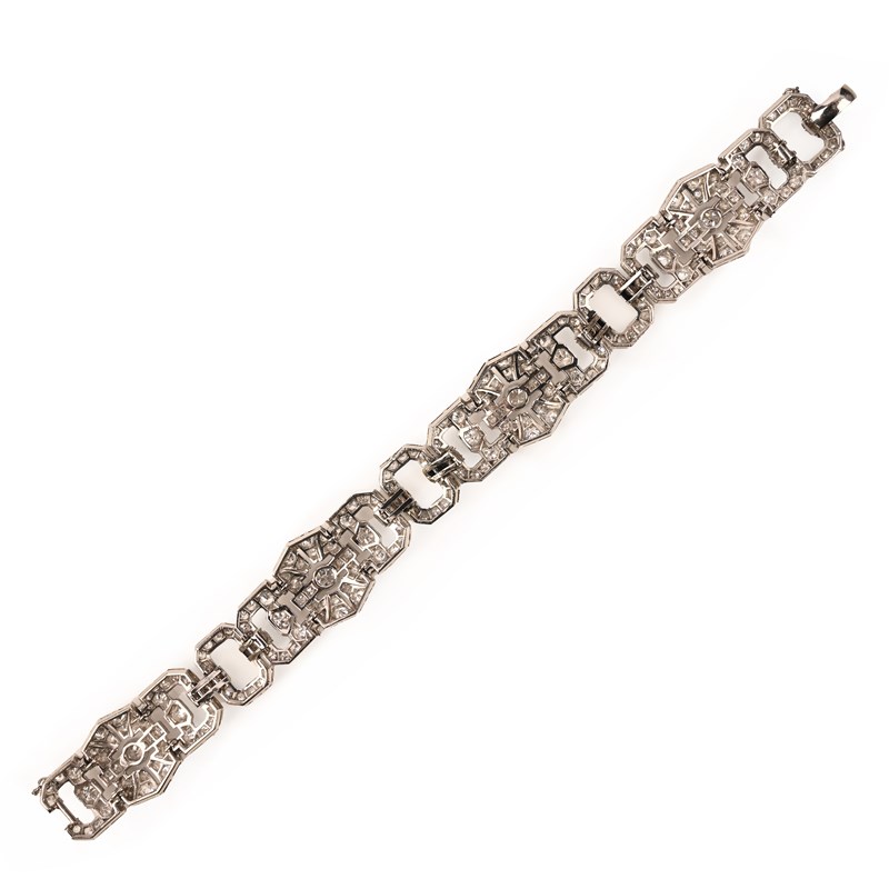 AN ART DECO DIAMOND BRACELET, of pierced geometric design, millegrain-set with graduated old circular-cut diamonds in platinum, length 18cm