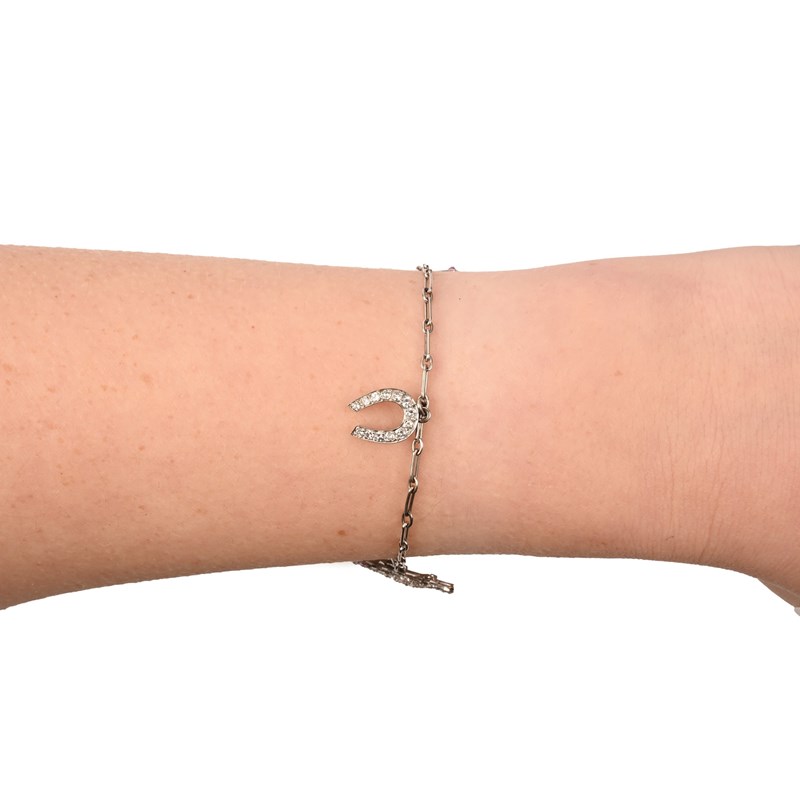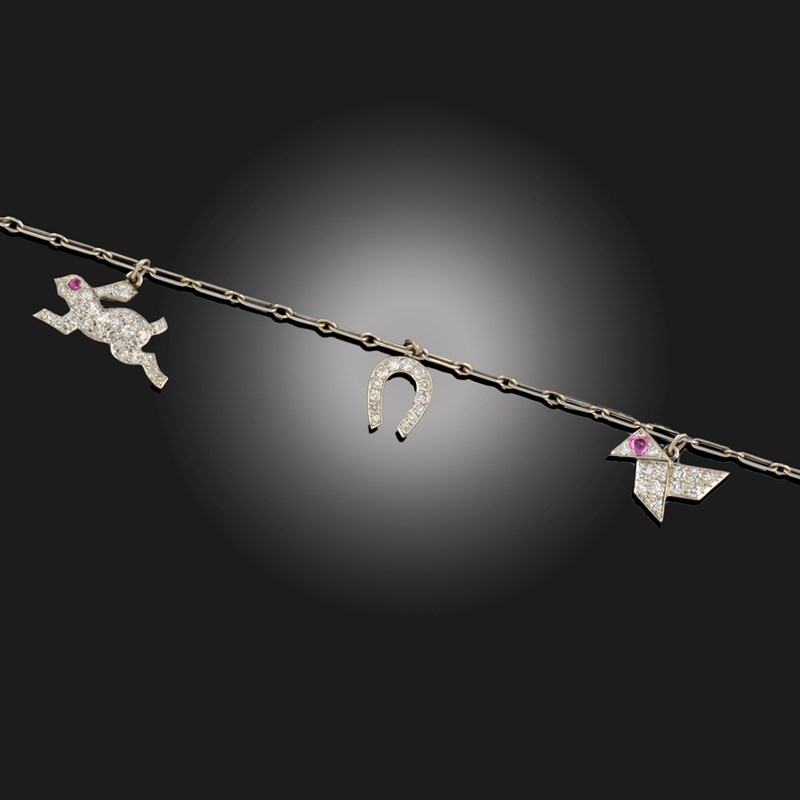 AN ART DECO CHARM BRACELET, the oval-link platinum bracelet suspending three gem-set charms including a leaping hare set with single-cut diamonds and a ruby eye, a diamond-set horseshoe and a stylised bird set with single-cut diamonds and a ruby cabochon eye, length 16.2cm