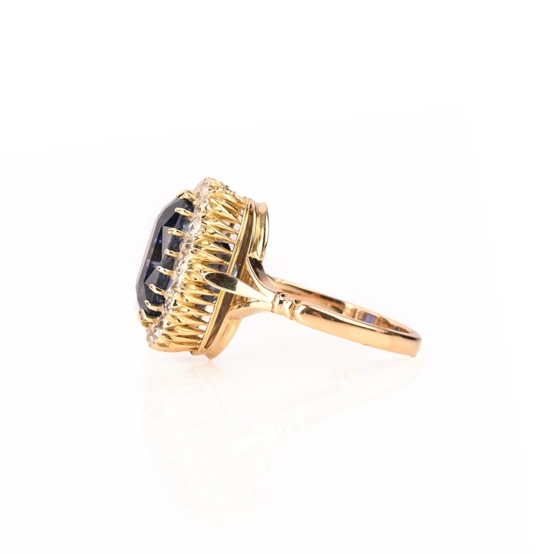 A SAPPHIRE AND DIAMOND CLUSTER RING, the oval-shaped blue sapphire weighing 9.44cts set within a surround of old cushion-shaped diamonds in yellow gold, size P