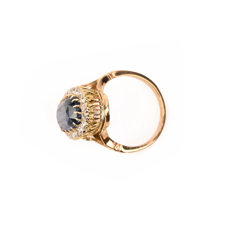 A SAPPHIRE AND DIAMOND CLUSTER RING