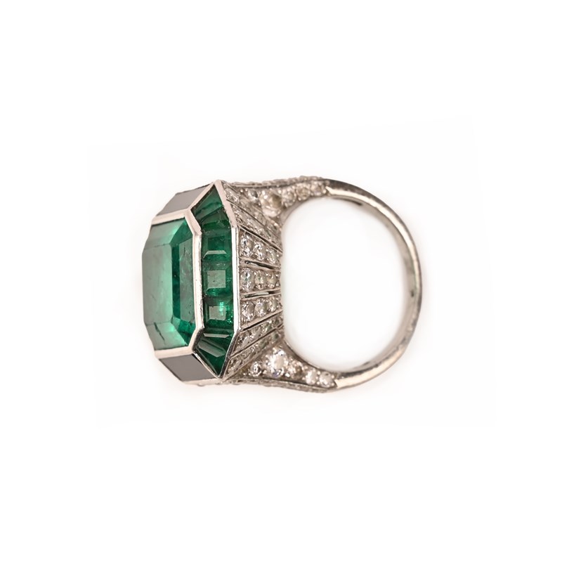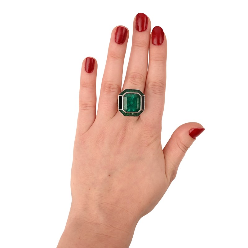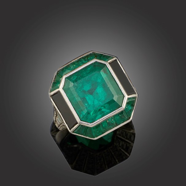 AN EMERALD, DIAMOND AND ONYX DRESS RING, with a step-cut emerald to the centre weighing approximately 13.00cts, within a border of channel-set step-cut emeralds and onyx panels, the shoulders and setting set with graduated old circular-cut and baguette-cut diamonds, in platinum, size P 1/2