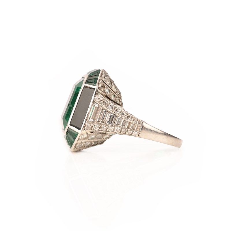 AN EMERALD, DIAMOND AND ONYX DRESS RING