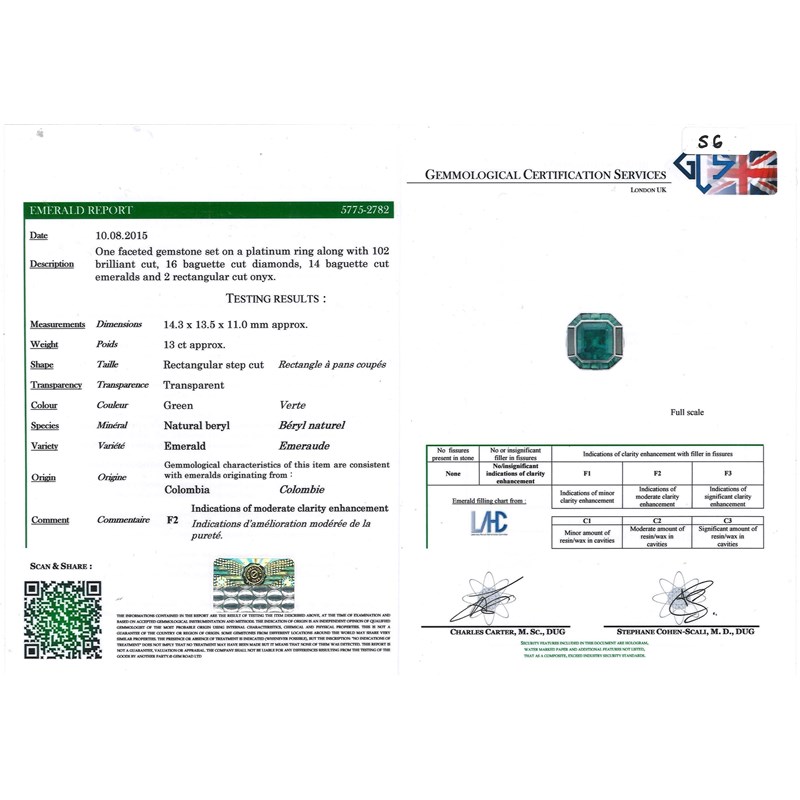 Accompanied by GCS report number 5775-2782, dated 10th August 2015, stating that the rectangular step-cut emerald weighing approximately 13.00cts shows indications of moderate clarity enhancement, origin: Colombia