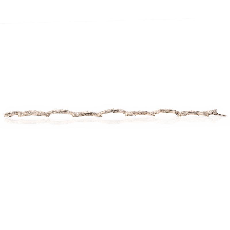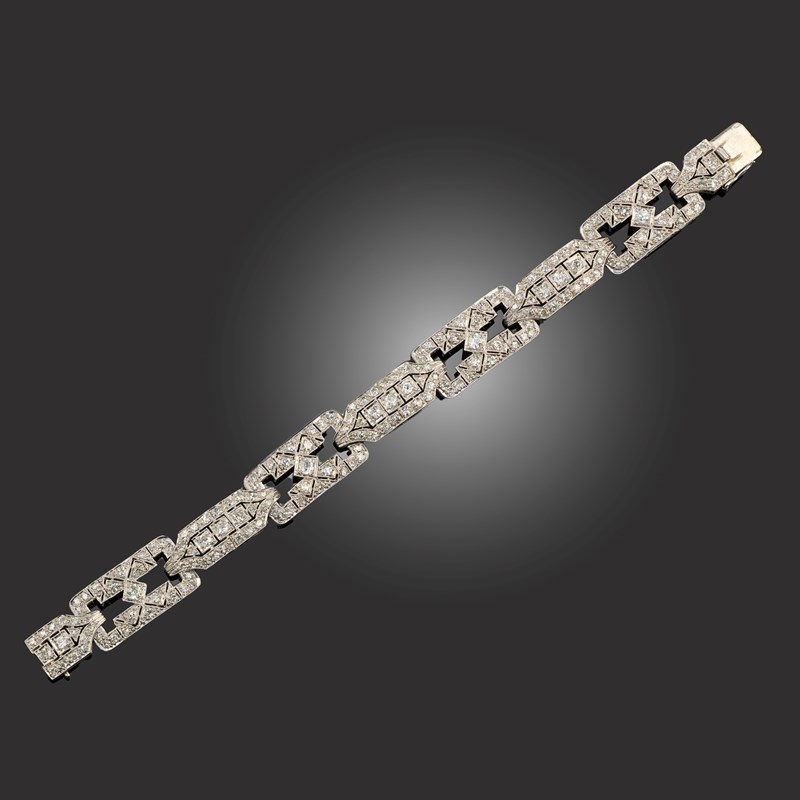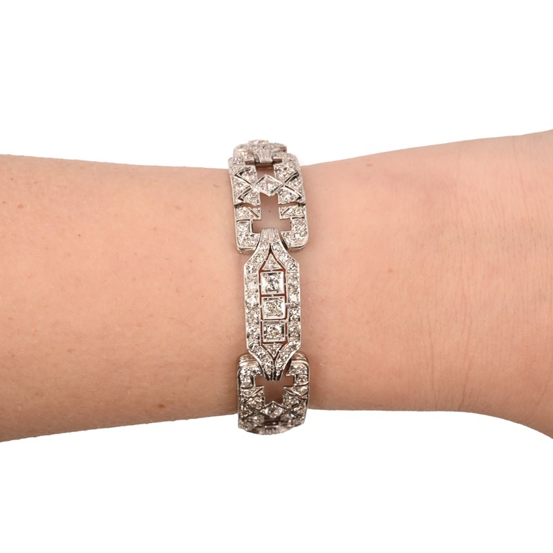 A DIAMOND STRAP BRACELET, composed of alternating articulated links of pierced geometric design, with old circular-cut diamonds in milligrain settings, mounted in platinum, length 18.2cm