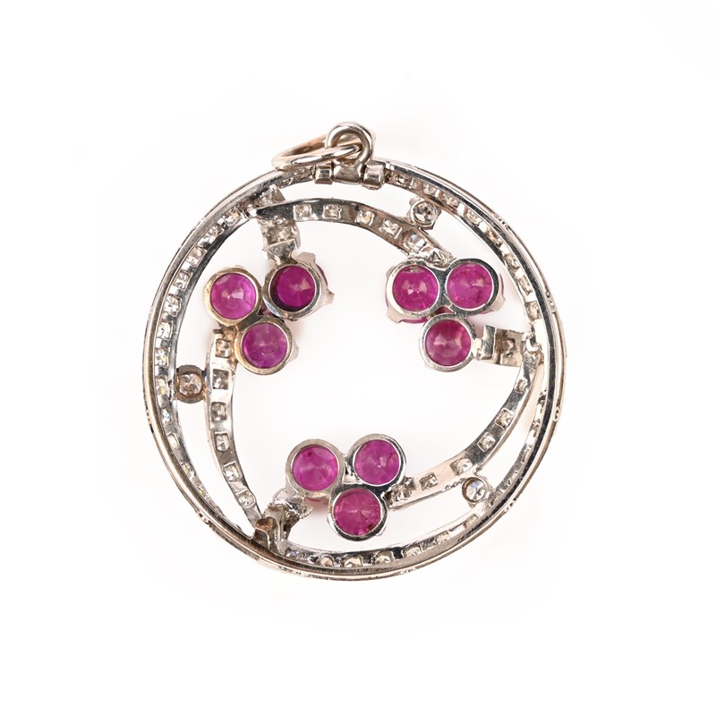 A RUBY AND DIAMOND PENDANT, of circular openwork design, set with single-cut diamonds and clusters of circular-cut rubies, in white gold, converted from a brooch, diameter 2.8cm, gross weight 6g
