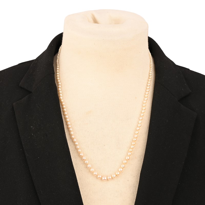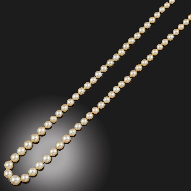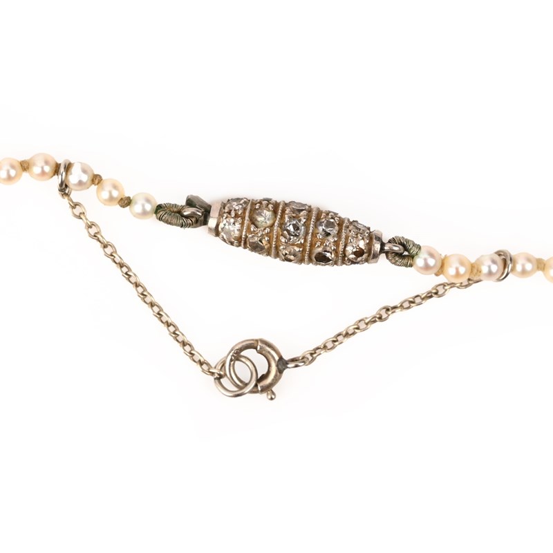 A NATURAL PEARL AND DIAMOND NECKLACE, EARLY 20TH CENTURY, composed of a single strand of graduated pearls measuring 2.11-5.59mm, to a platinum barrel clasp set with rose-cut diamonds, length 54.5cm, case