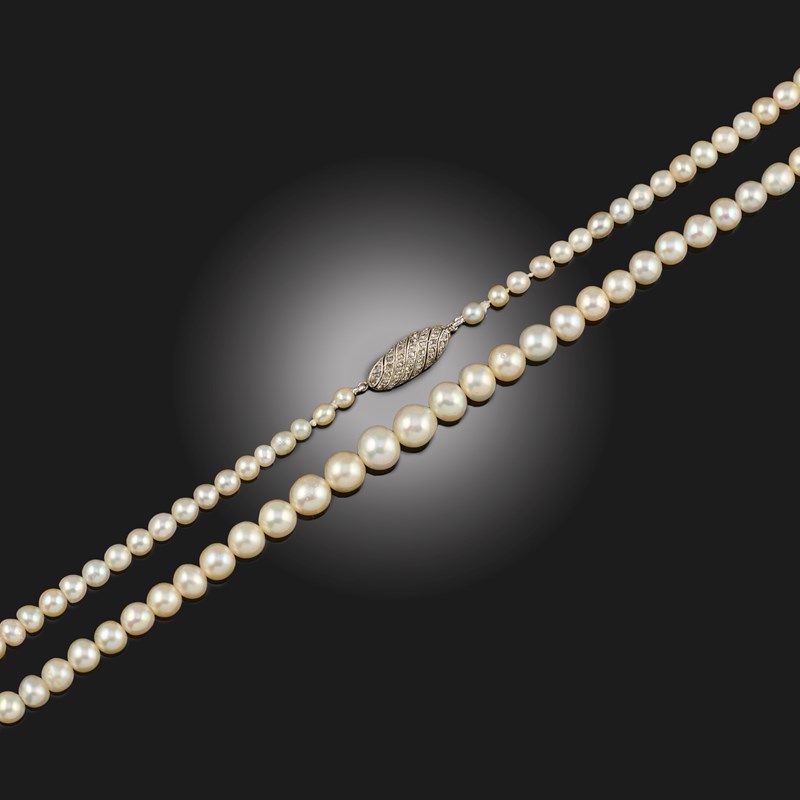 A SINGLE ROW NATURAL PEARL NECKLACE, the pearls graduate from 3.4 to 7.9mm on an oval diamond-set clasp, length 44cm