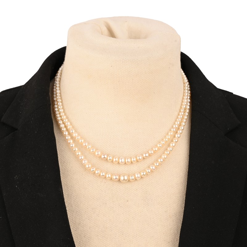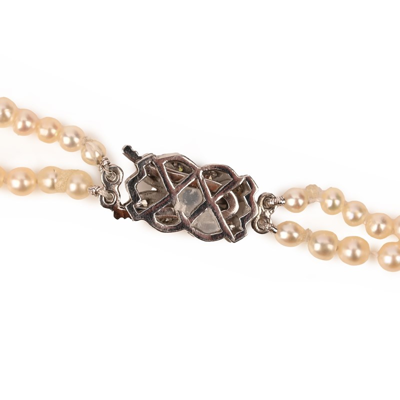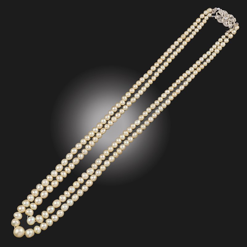 A TWO ROW NATURAL PEARL NECKLACE, the pearls graduate from 2.9 to 7.9mm, on a diamond cluster clasp, 44cm longest