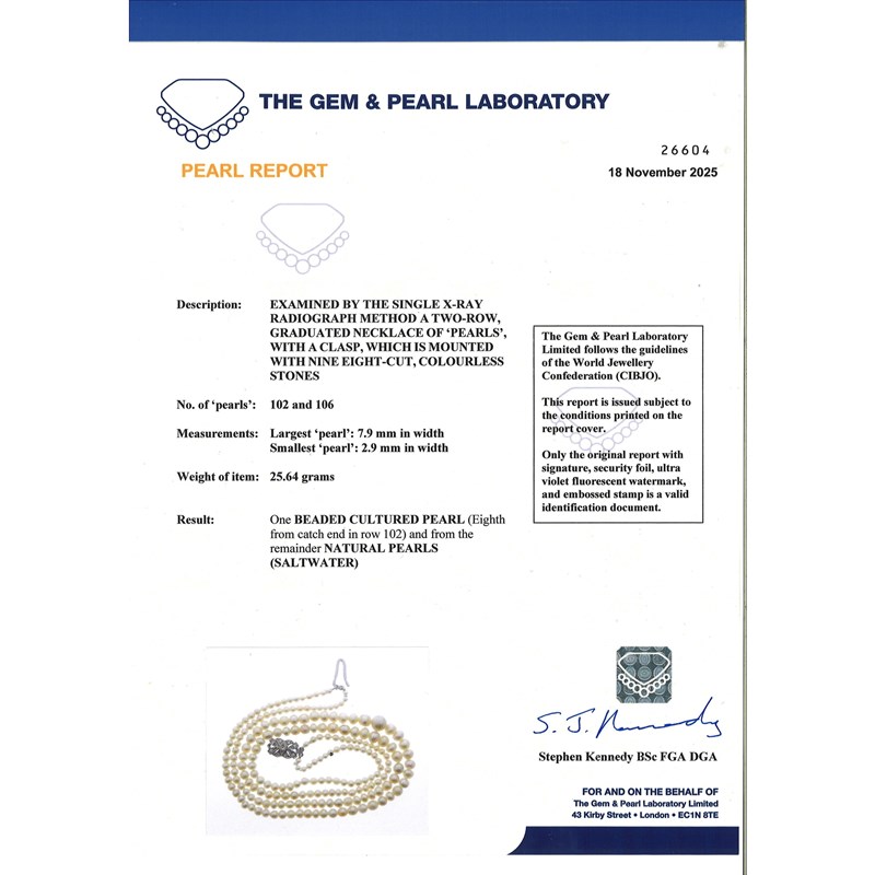 Accompanied by report number 26604 dated 18th November 2025 from The Gem and Pearl Lab stating that the pearls are natural saltwater with the exception of one cultured pearl (eighth from catch end in row 2)