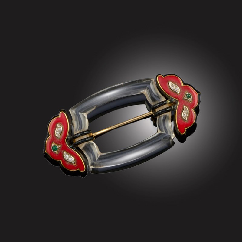 AN ART DECO ROCK CRYSTAL, ENAMEL, DIAMOND AND EMERALD BROOCH, with a rectangular carved rock crystal centrepiece to emerald cabochon and diamond-set panels, with a red enamel ground and black enamel borders, in yellow gold, numbered 985 and EX41, length 5.2cm