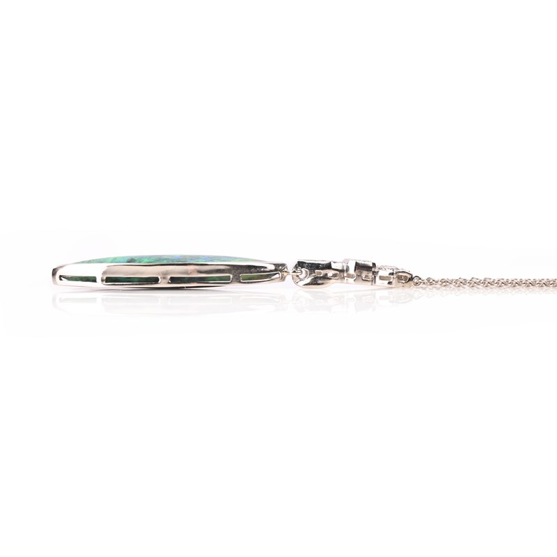 A BLACK OPAL AND DIAMOND PENDANT, the lozenge-shaped black opal cabochon is rubover-set beneath diamond-set surmount in platinum, on fine-link platinum neck chain, pendant length 5.5cm, chain length 38cm