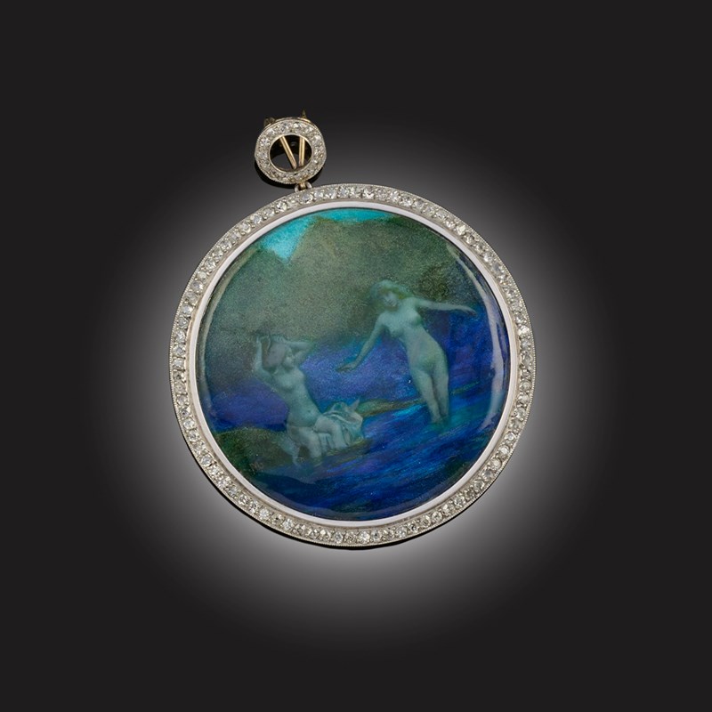AN ENAMEL AND DIAMOND PENDANT, EARLY 20TH CENTURY, of circular form centring on an enamel plaque depicting naiads bathing in the water, within diamond surround and suspending from a diamond-set hoop in platinum, length 6.5cm