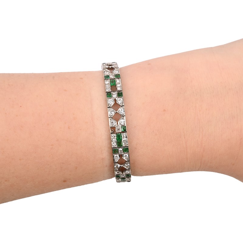 MAUBOUSSIN, AN ART DECO EMERALD AND DIAMOND BRACELET, C1927, of geometric design set with emerald-cut emeralds and old circular-cut diamonds in platinum, numbered 89596, two emeralds missing, with an additional link, length 16.5cm