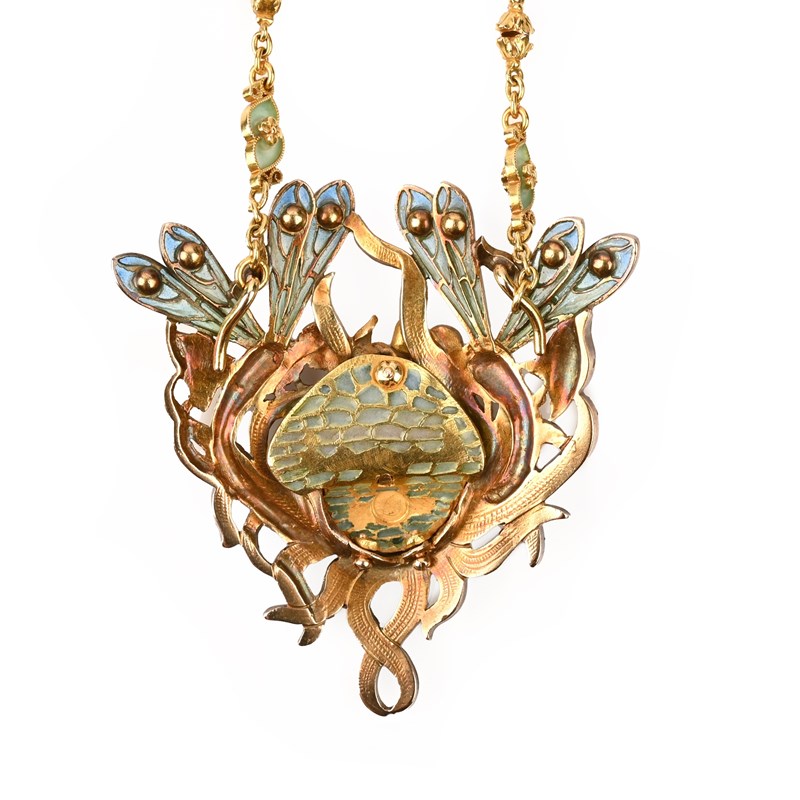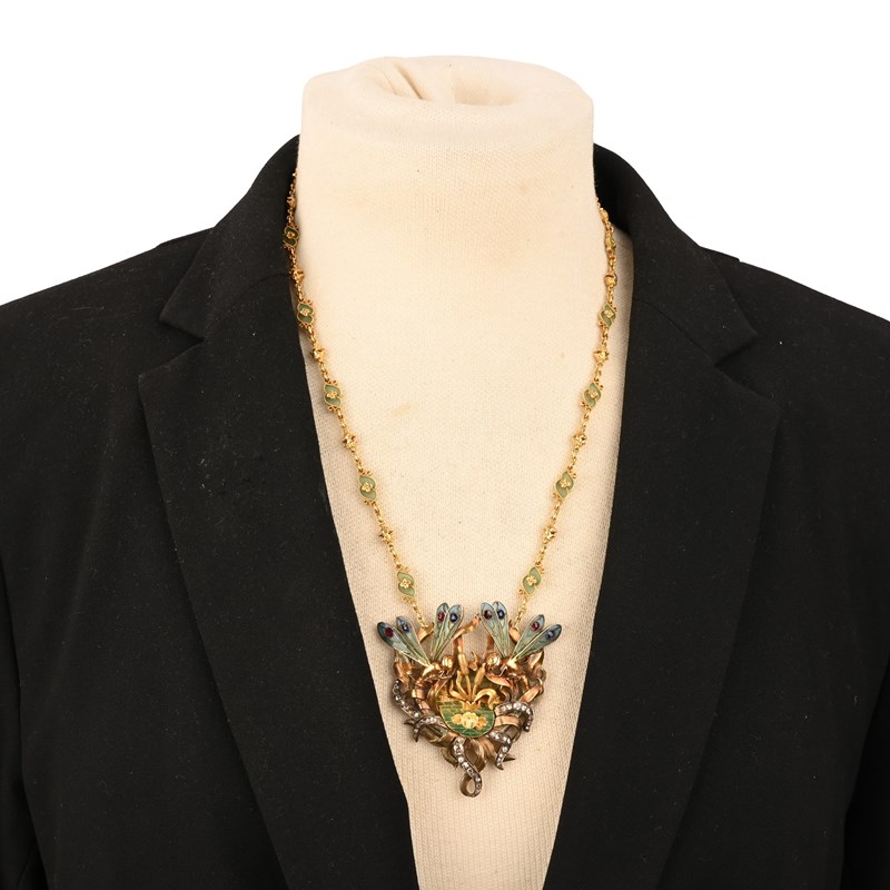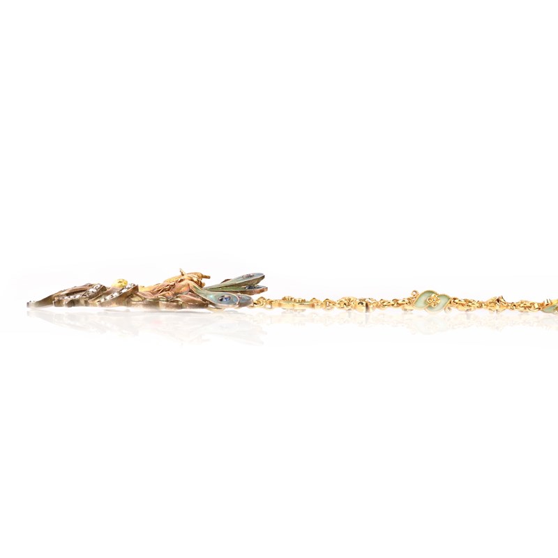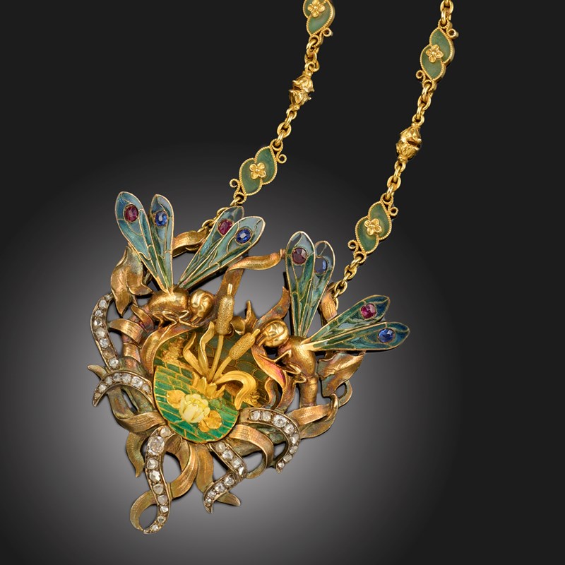 AN ART NOUVEAU DIAMOND, GOLD AND ENAMEL PENDANT, C1905, centred with a lily pond with bullrushes and two dragonflies to the upper section set with graduated foliage, the lily pond and dragonfly wings decorated with plique-à-jour enamel, with French control mark to upper section, length 6.3cm, to an Art Nouveau gold and enamel decorative chain, alternately mounted with inverted pairs of small flower heads and foliate scrolls, with plique-à-jour enamel decoration, length 52cm, with case, indistinctly signed silk lining and addressed to 104 Bd Sébatopol, Paris