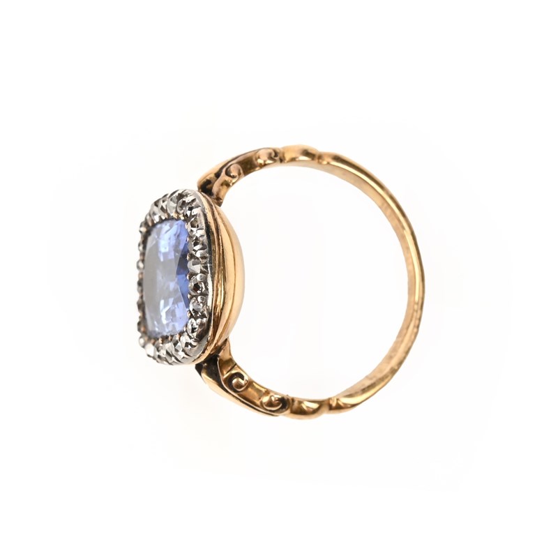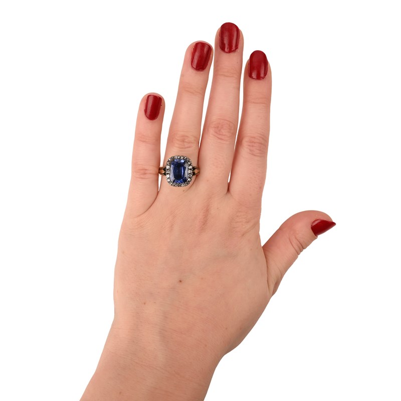 A SAPPHIRE AND DIAMOND CLUSTER RING, the cushion-shaped sapphire set within a surround of old cushion-shaped diamonds in silver on gold closed back setting, approximately size N