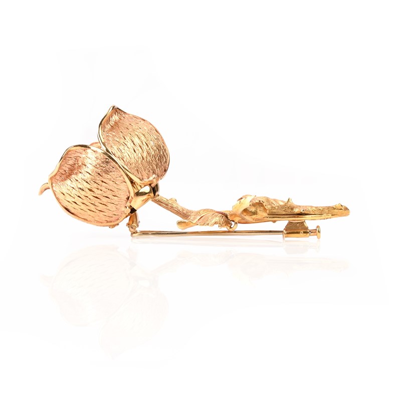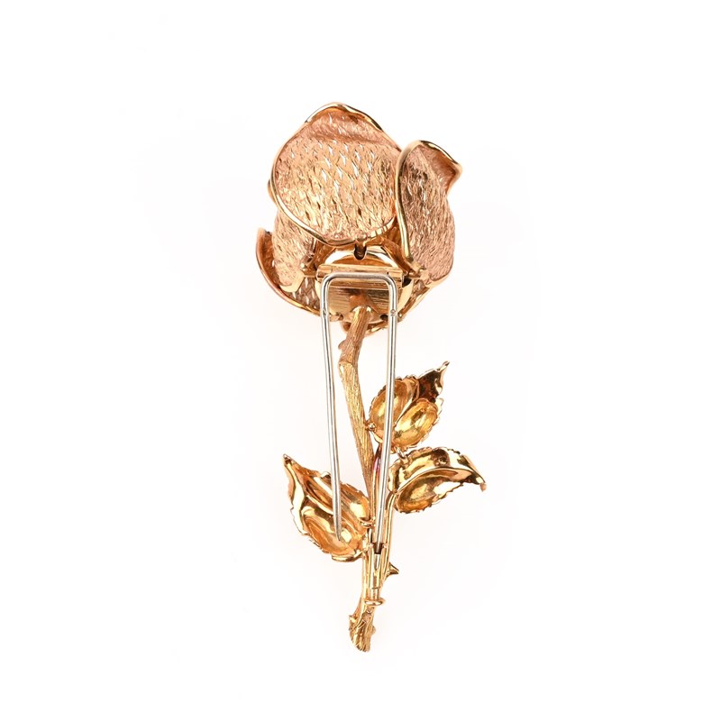 A FINE DIAMOND AND GOLD BROOCH, DESIGNED AS A WILD ROSE, set to the centre with a cluster of circular-cut diamonds, individually mounted en tremblant, within five hinged pierced petals which open and close, to a realistically modelled stem, in yellow gold, maker's lozenge partially worn, French control marks, length 7cm, 26g