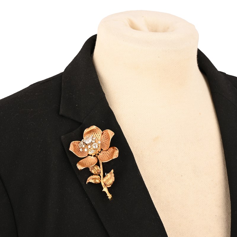 A FINE DIAMOND AND GOLD BROOCH, DESIGNED AS A WILD ROSE