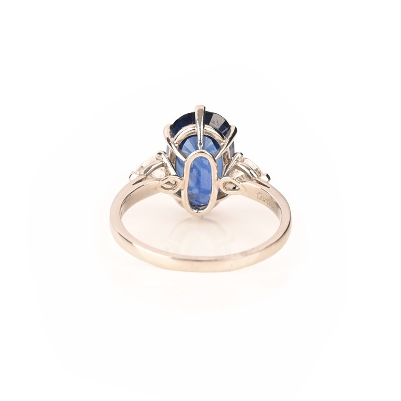 CARTIER, A SAPPHIRE AND DIAMOND RING, set with an oval sapphire flanked with pear-shaped diamonds in platinum, signed Cartier and maker's mark JC, with London hallmarks for 1981, size O 1/2