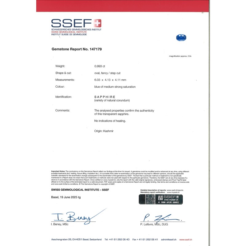 Accompanied by report number 147179 dated 19th June 2025 from SSEF stating that the sapphire weighing 0.993cts, with blue of medium strong saturation shows no indication of heating, origin: Kashmir
