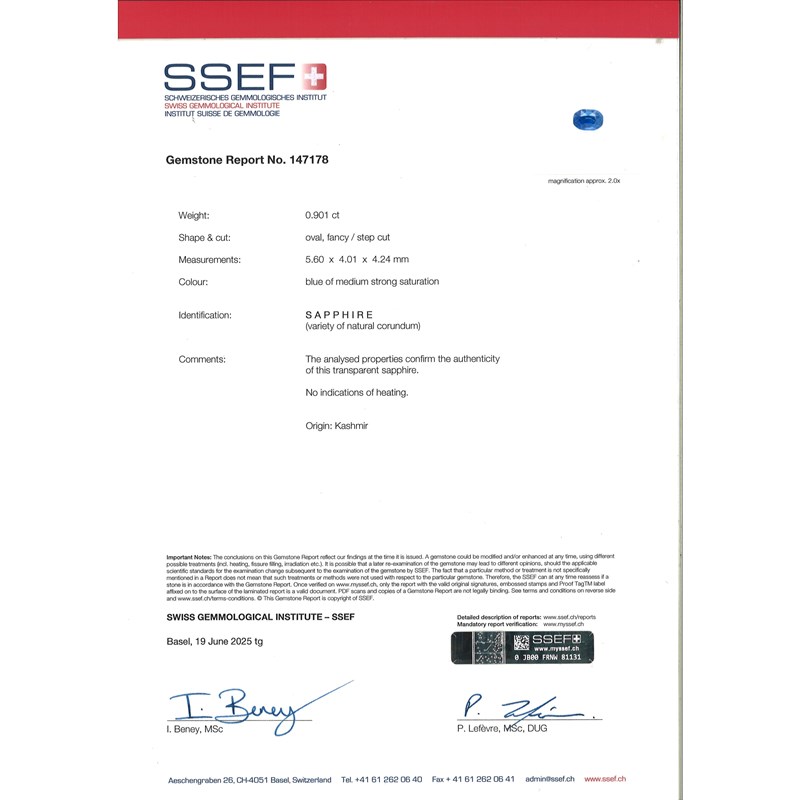 Accompanied by report number 147178 dated 19th June 2025 from SSEF stating that the sapphire, weighing 0.901cts with blue medium strong saturation shows so indications of heating, origin: Kashmir