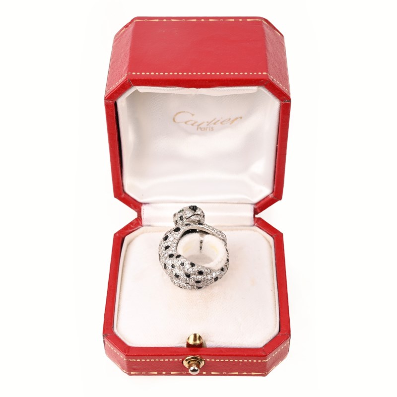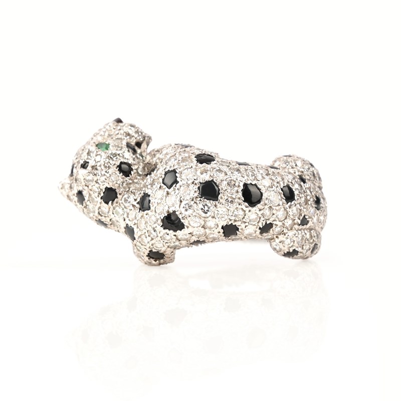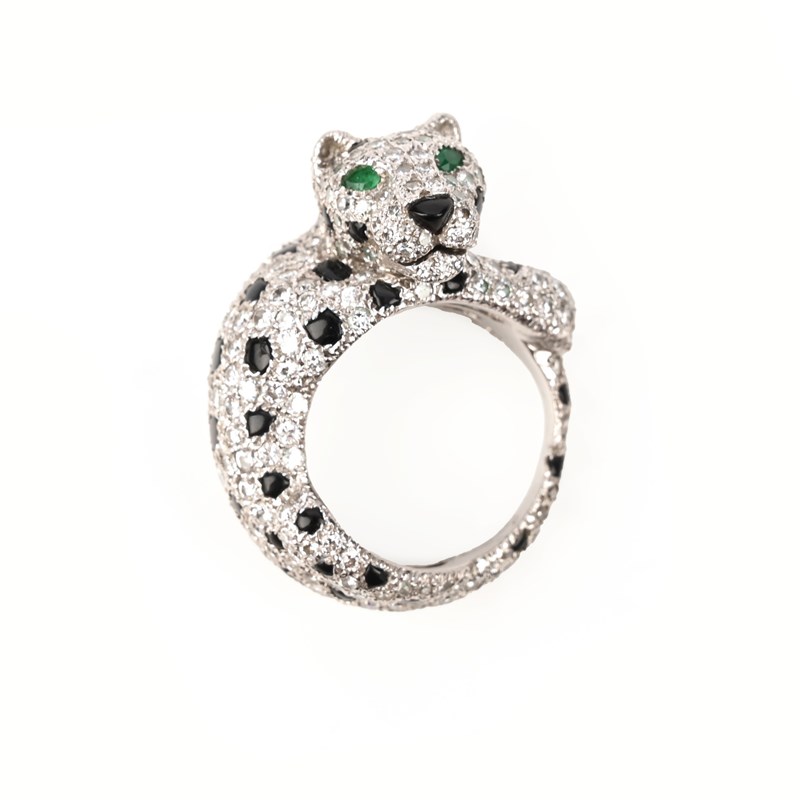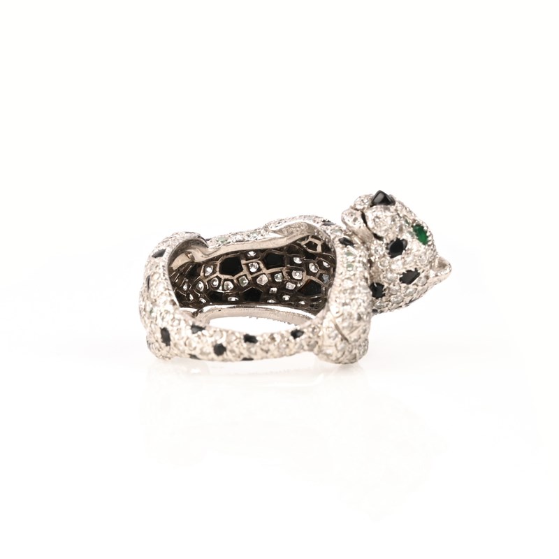 CARTIER, A GEM-SET PANTHÈRE RING, C1980s, designed as a crouching panther, pavé-set with round brilliant-cut diamonds and onyx cabochons, its eyes set with pear-shaped emeralds, mounted in platinum, signed Cartier, Paris, numbered 128102, stamped Pt950, total approximate diamond weight 2.50cts, size K, case stamped Cartier Paris