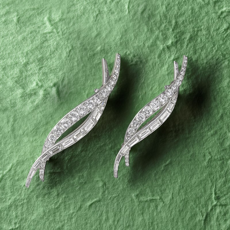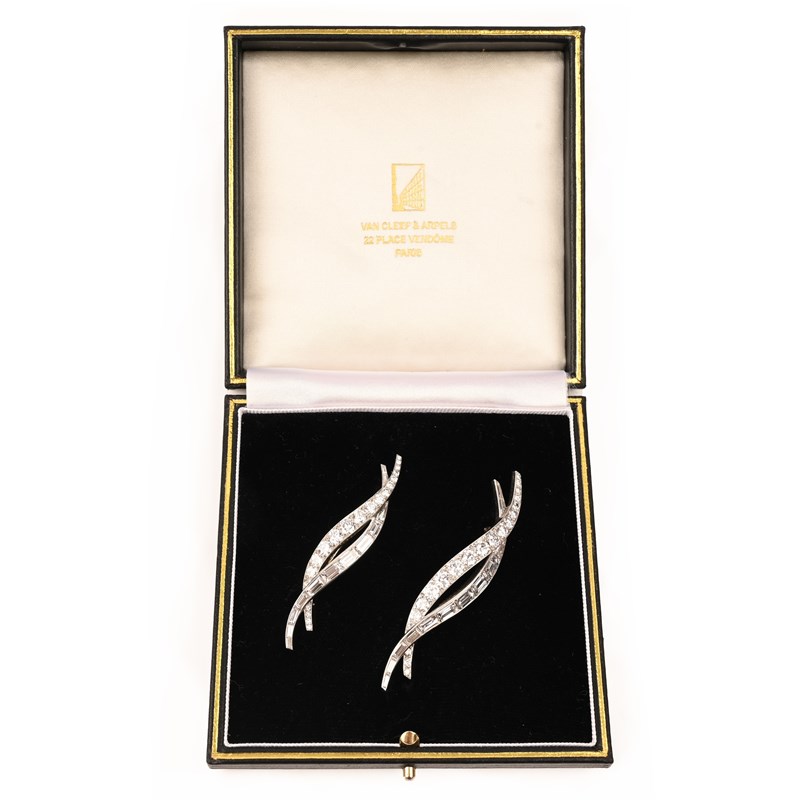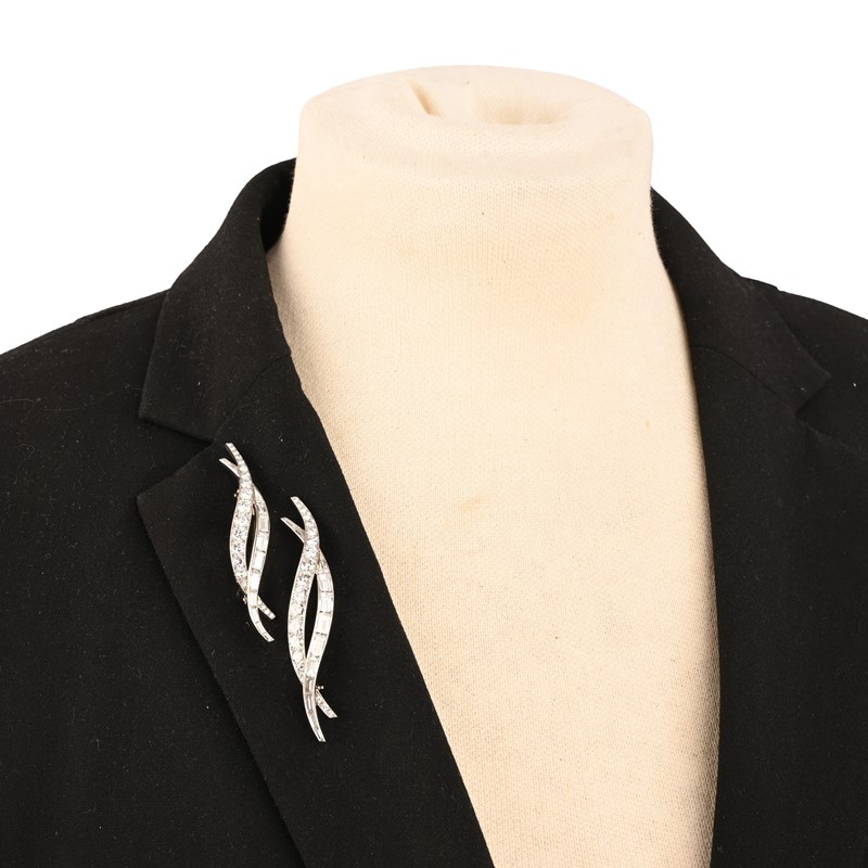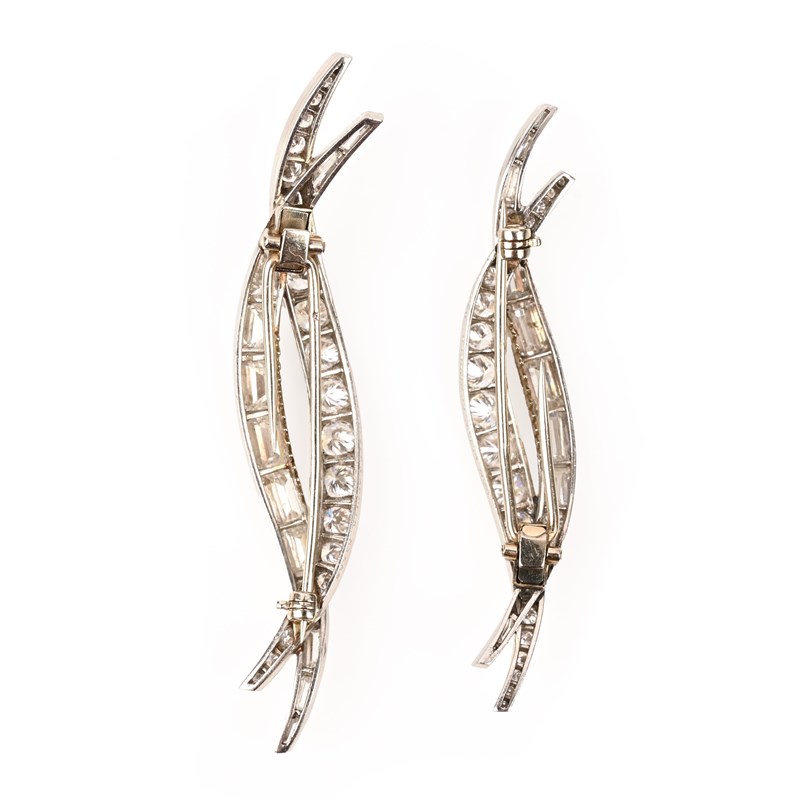 VAN CLEEF & ARPELS, TWO DIAMOND-SET FLAME BROOCHES, C1940s, both set with interlocking bands of circular-cut and baguette-shaped diamonds channel-set in platinum and white gold, the larger brooch signed Van Cleef & Arpels and numbered 83688 with French control marks and maker's lozenge for Dumont & Compagnie, length 6.7cm, the smaller brooch signed Van Cleef et Arpels and numbered 86021 with French control marks and maker's lozenge for Dumont & Compagnie, length 5.8cm