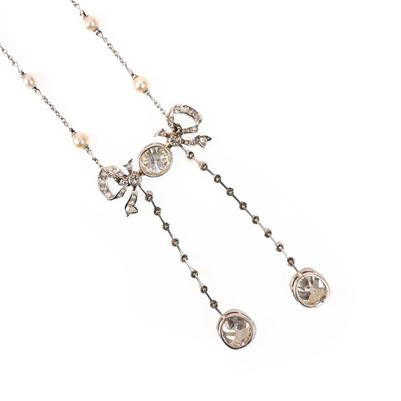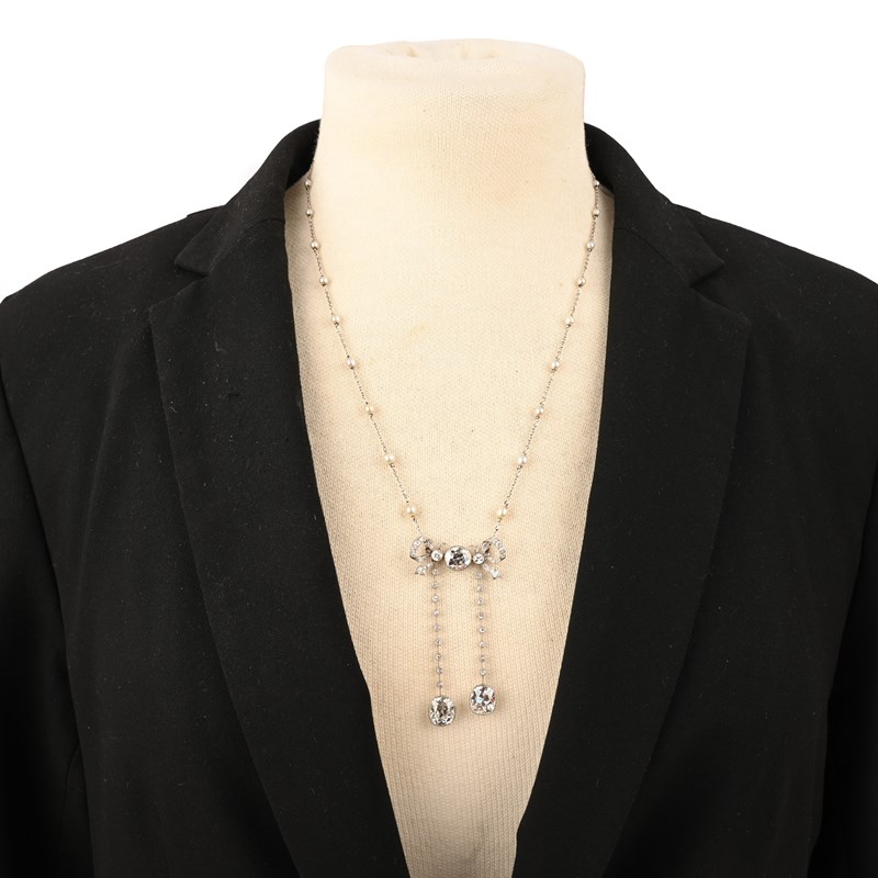 A BELLE ÉPOQUE DIAMOND AND PEARL PENDANT NECKLACE, of negligée design, centred with an old circular-cut diamond, weighing approximately 1.60cts, milligrain-set between diamond-set ribbon-tie motifs, suspending two rows of knife-edge linking accented with single-cut diamonds, each suspending a milligrain-set cushion-shaped diamond, the diamond on the left weighing approximately 3.00cts and the diamond on the right weighing approximately 2.80cts, all in platinum, to a fine link platinum back chain set with pearls, pearls untested, pendant length 6cm, chain length 51cm
