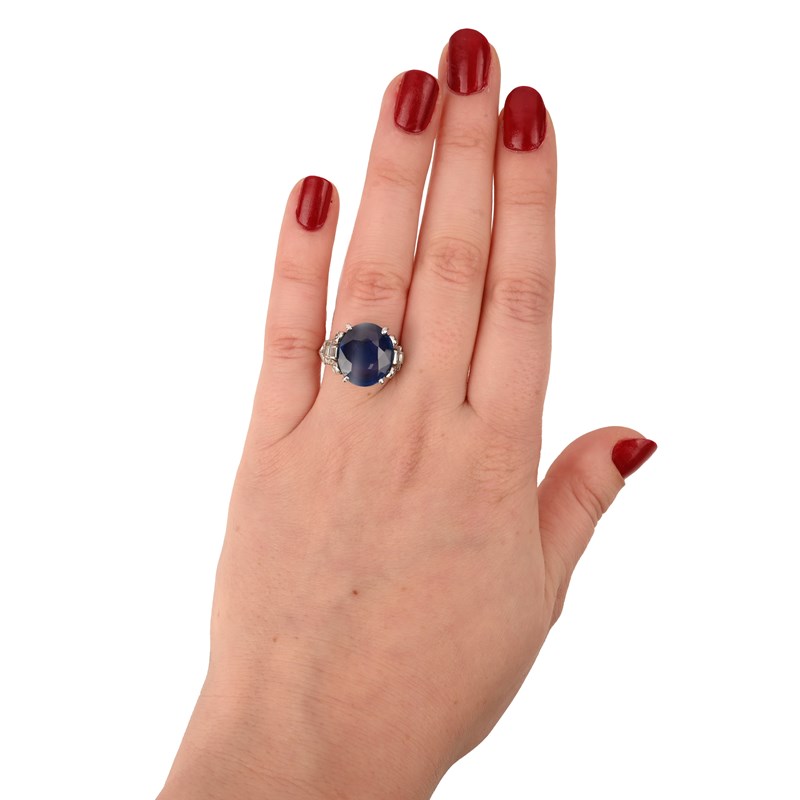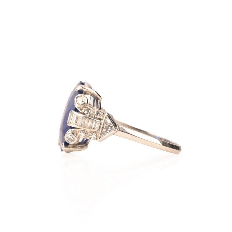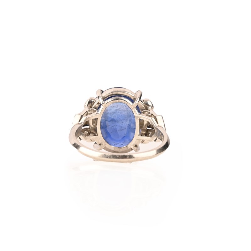A SAPPHIRE AND DIAMOND RING, C1930, set with an oval-shaped sapphire weighing 8.20cts, within scrolling diamond shoulders in iridium and platinum, internal inscription for 1936, size O 1/2