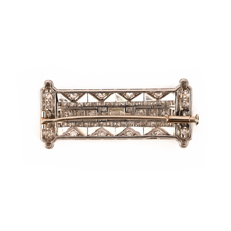 AUGUST PAILLETTE, A FRENCH ART DECO DIAMOND BROOCH, C1925, of geometric design, centred with a step-cut diamond to a pierced surround set with old circular-cut and single-cut diamonds, raised above a textured platinum zig-zag motif set with single-cut diamonds between two diamond-set terminals, mounted in platinum, French control marks and maker's lozenge, width 4.3cm