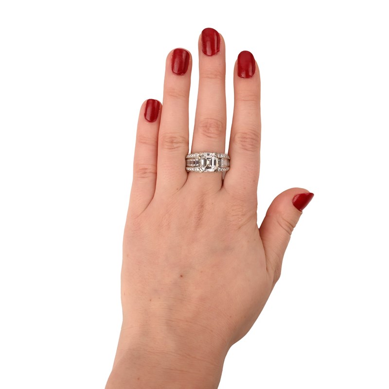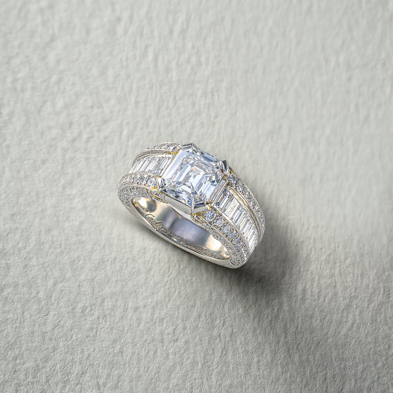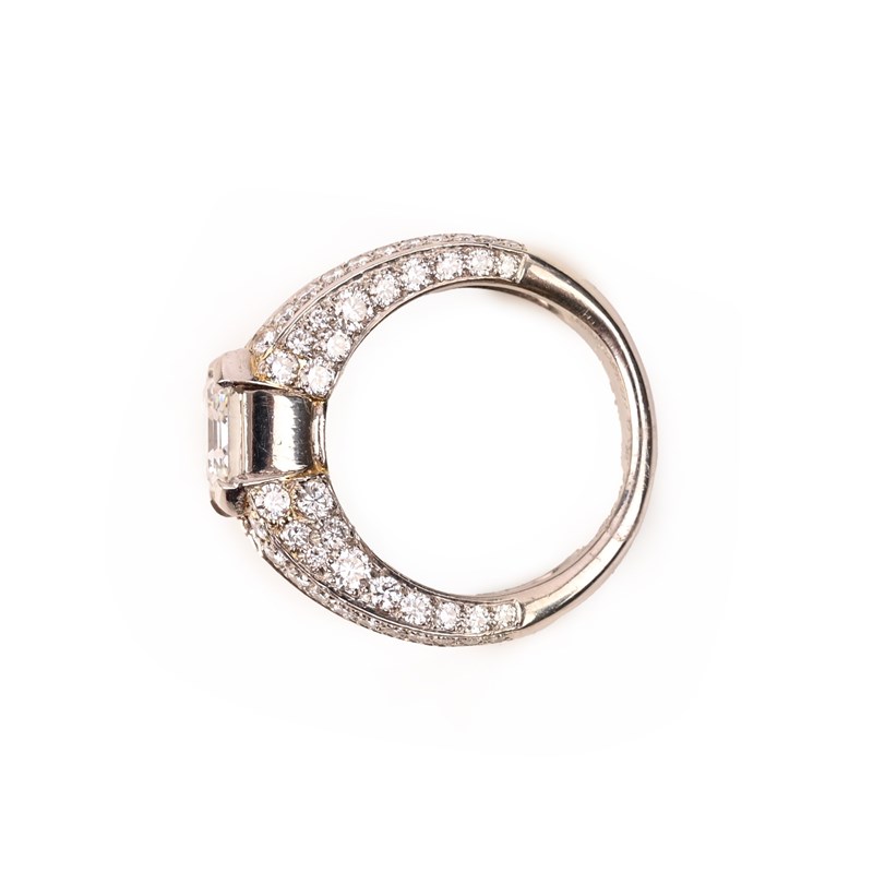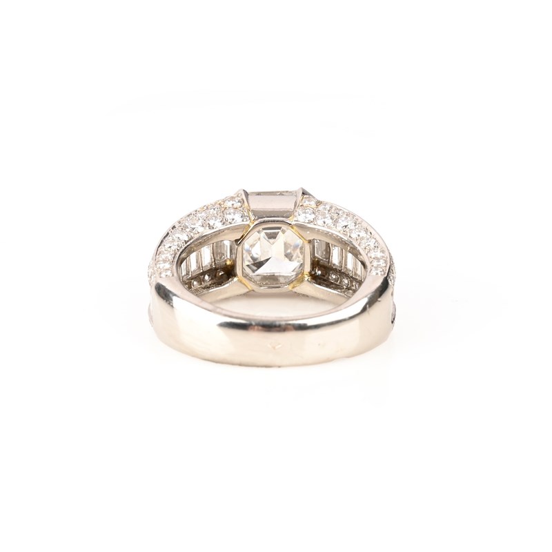 CARTIER, A DIAMOND DRESS RING, set with an Asscher-cut diamond weighing 4.00cts within shoulders set with graduated round brilliant-cut and baguette-shaped diamonds with diamonds set to the gallery in platinum, signed Cartier and numbered HLS805646, with French maker's lozenge for AF, size Q