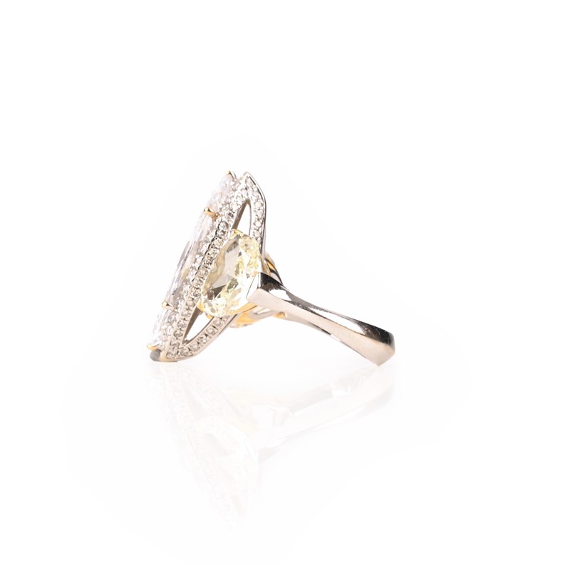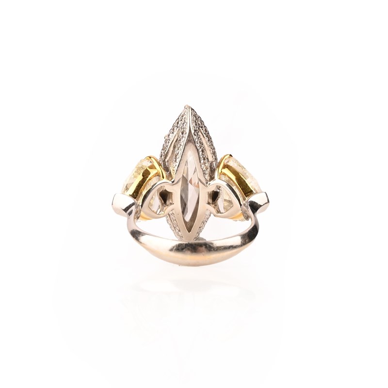 AN IMPRESSIVE DIAMOND THREE STONE RING, set with a marquise-shaped diamond to the centre weighing 3.68cts, within a round brilliant-cut diamond-set surround, flanked with heart-shaped yellow diamond shoulders, in white and yellow gold, the heart shaped diamonds weighing approximately 2.00 and 1.90cts, size L