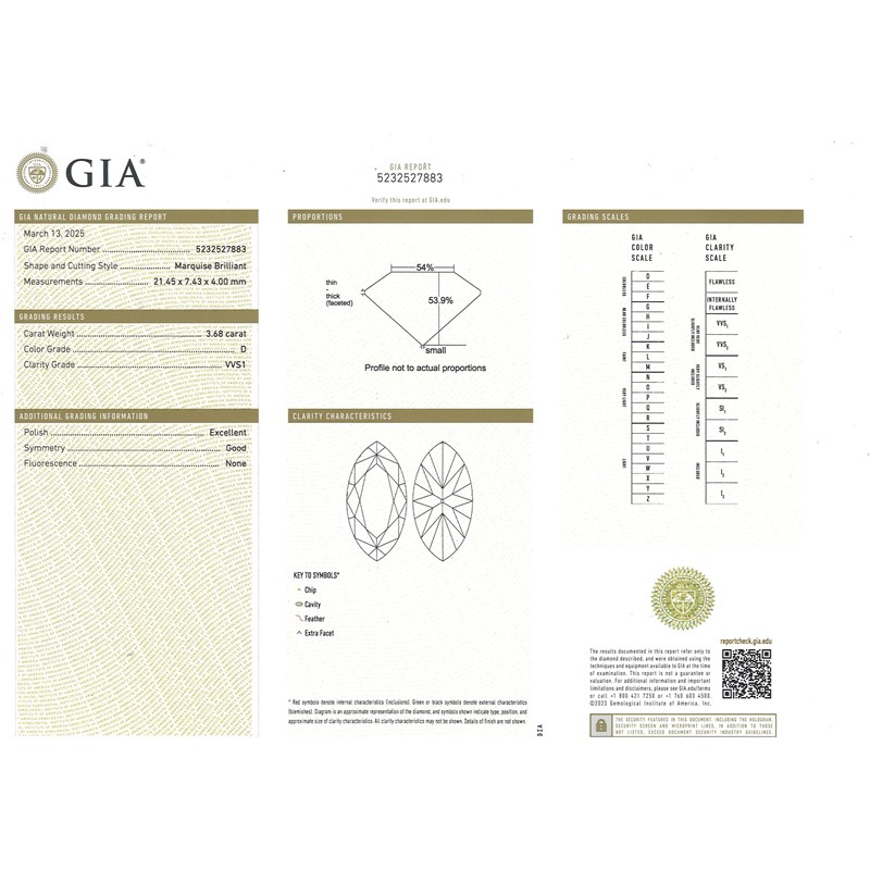 Accompanied by GIA report number 5232527883 dated 13th March 2025 stating that the marquise brilliant cut diamond weighs 3.68cts, is D colour and VVS1 clarity