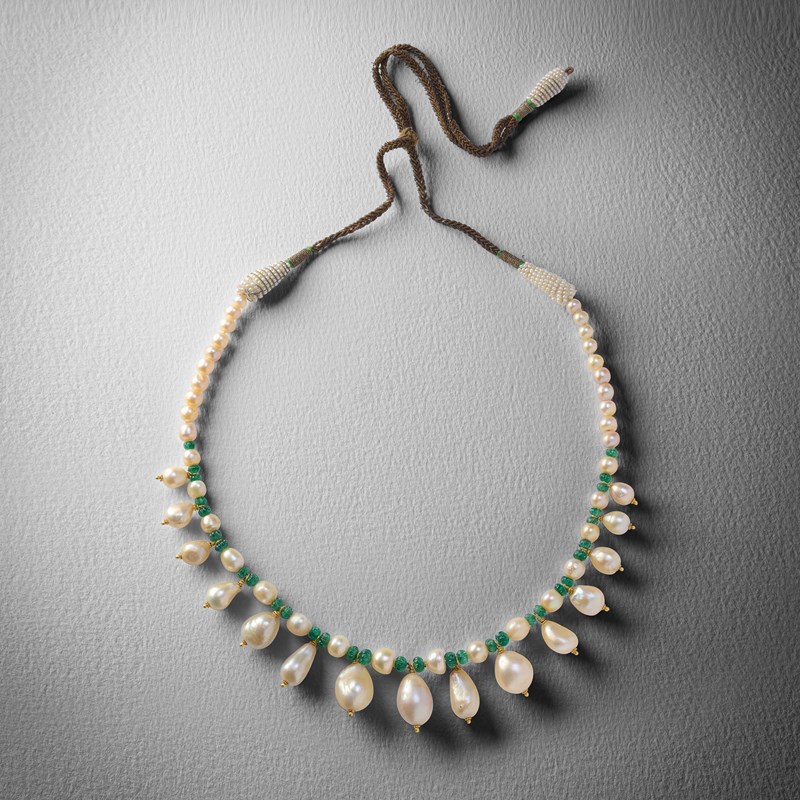 A NATURAL PEARL AND EMERALD NECKLACE, the graduated row of pearls alternately-set with carved emerald beads and suspending 15 graduated pearl drops with gold finials, total weight of emeralds 22.726cts, on a woven fabric back chain, length 60cm